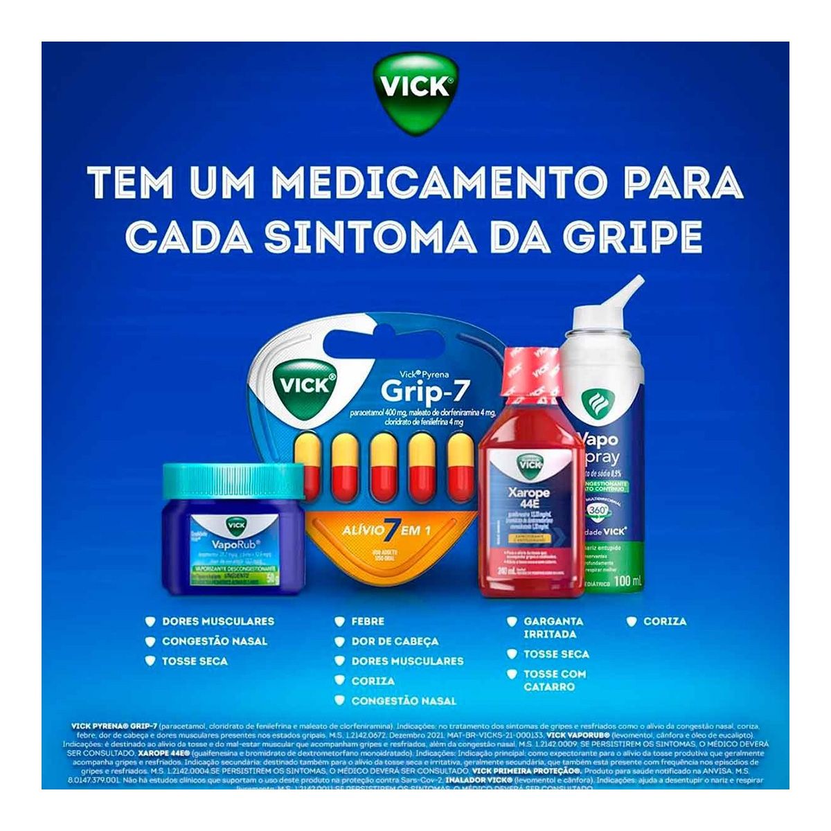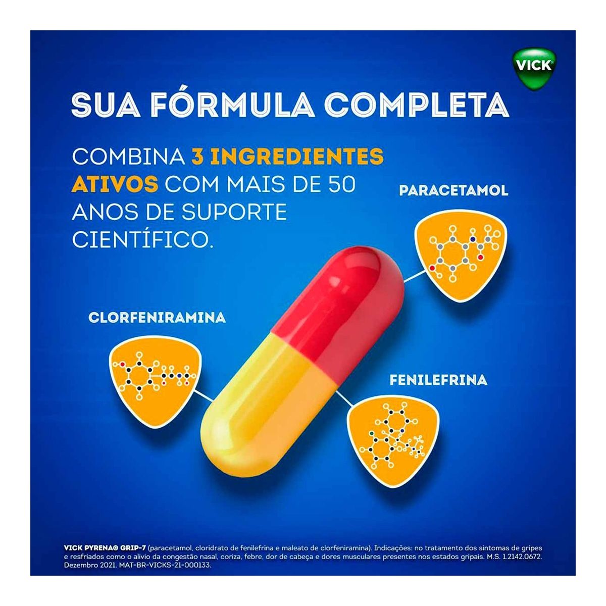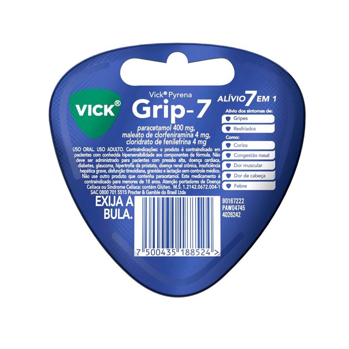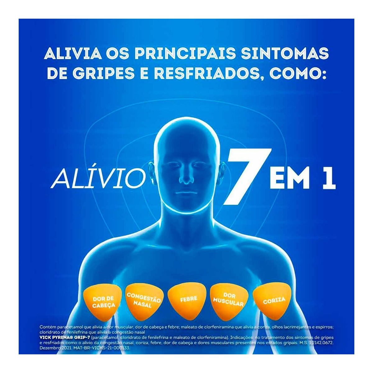 Vick Pyrena Grip-7 alivia sintomas de gripe e resfriado, reduz febre, combate coriza, descongestiona o nariz e alivia dores musculares e de cabeça. -