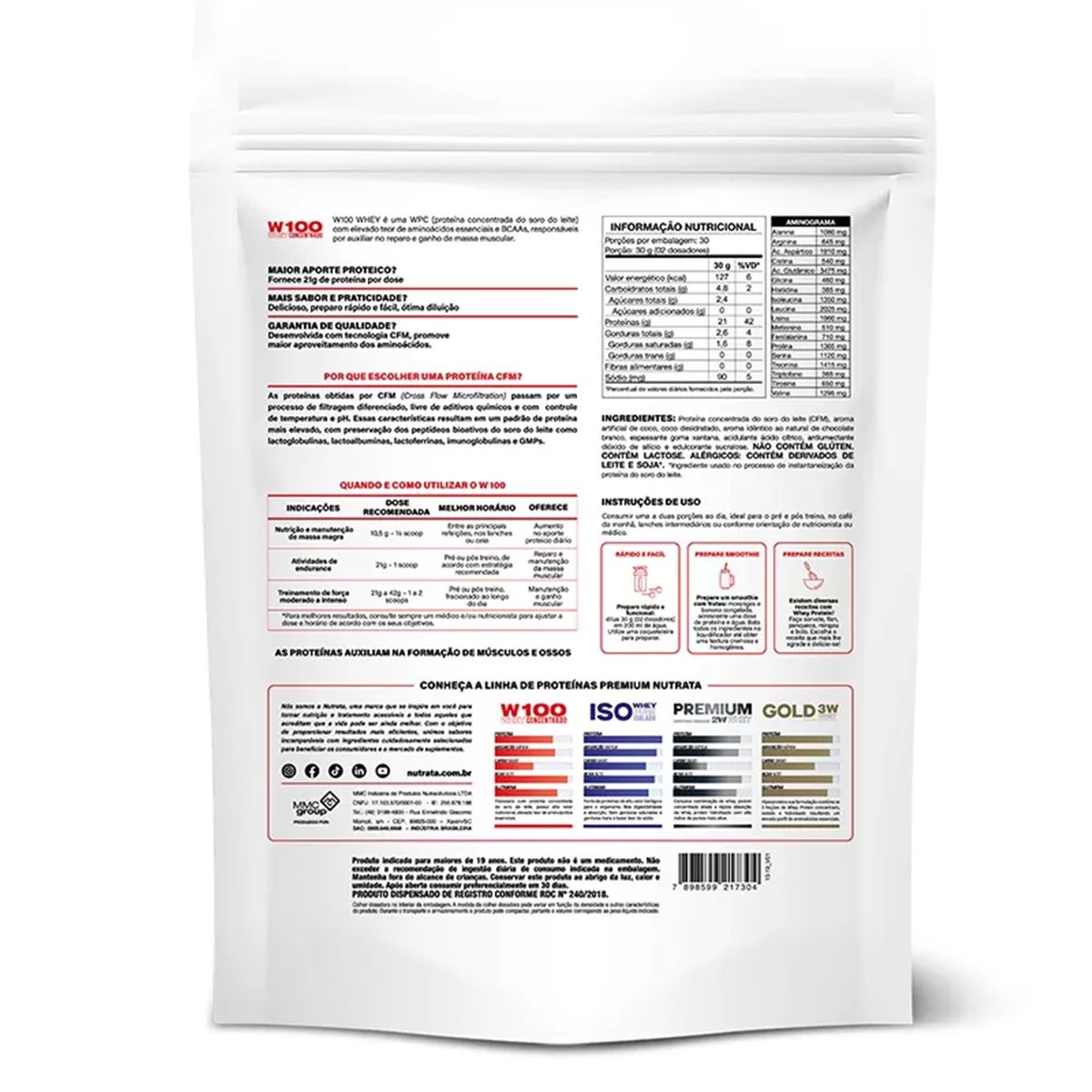 Além disso, o W100 possui alto valor nutricional e elevado teor de aminoácidos essenciais com destaque para os de cadeia ramificada. Por isso, auxilia na manutenção e ganho de massa muscular.