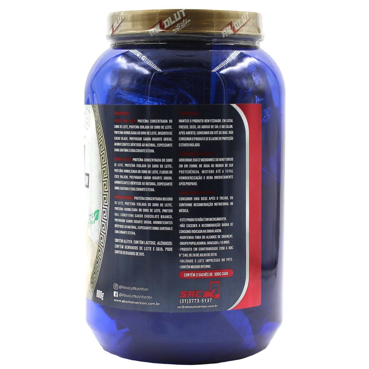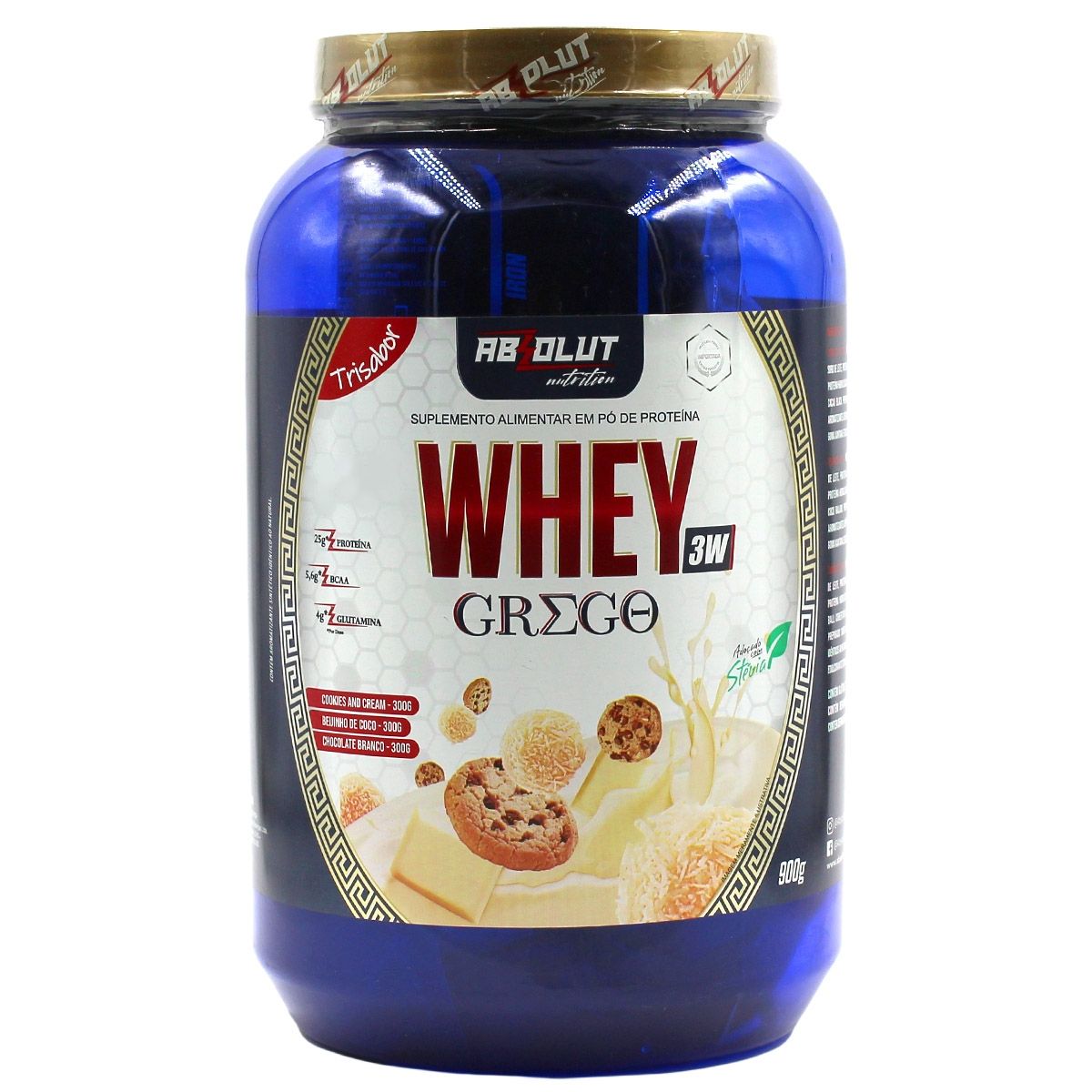 Qual é a quantidade total de produto no Whey 3W Grego Beijinho Cookie Chocolate Branco 900G Absolut Nutrition?