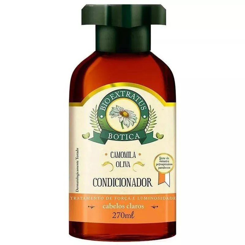 minerais, polímeros celulósicos e aminoácidos. Restaura o cabelo, melhora a textura e reduz o volume. Com pró-vitamina B5, atua diretamente no couro cabeludo e nas fibras capilares. Auxilia na retenção da umidade, evitando pontas bipartidas. Ajuda a reparar os danos causados por tratamentos químicos e agressões externas. O Bio Extratus Botica Camomila - Condicionador 270ml possui fórmula equilibrada que condiciona, nutre e desembaraça, devolvendo a força e a luminosidade aos cabelos claros. Conselho de Aplicação Para uso diário, deve ser usado após o