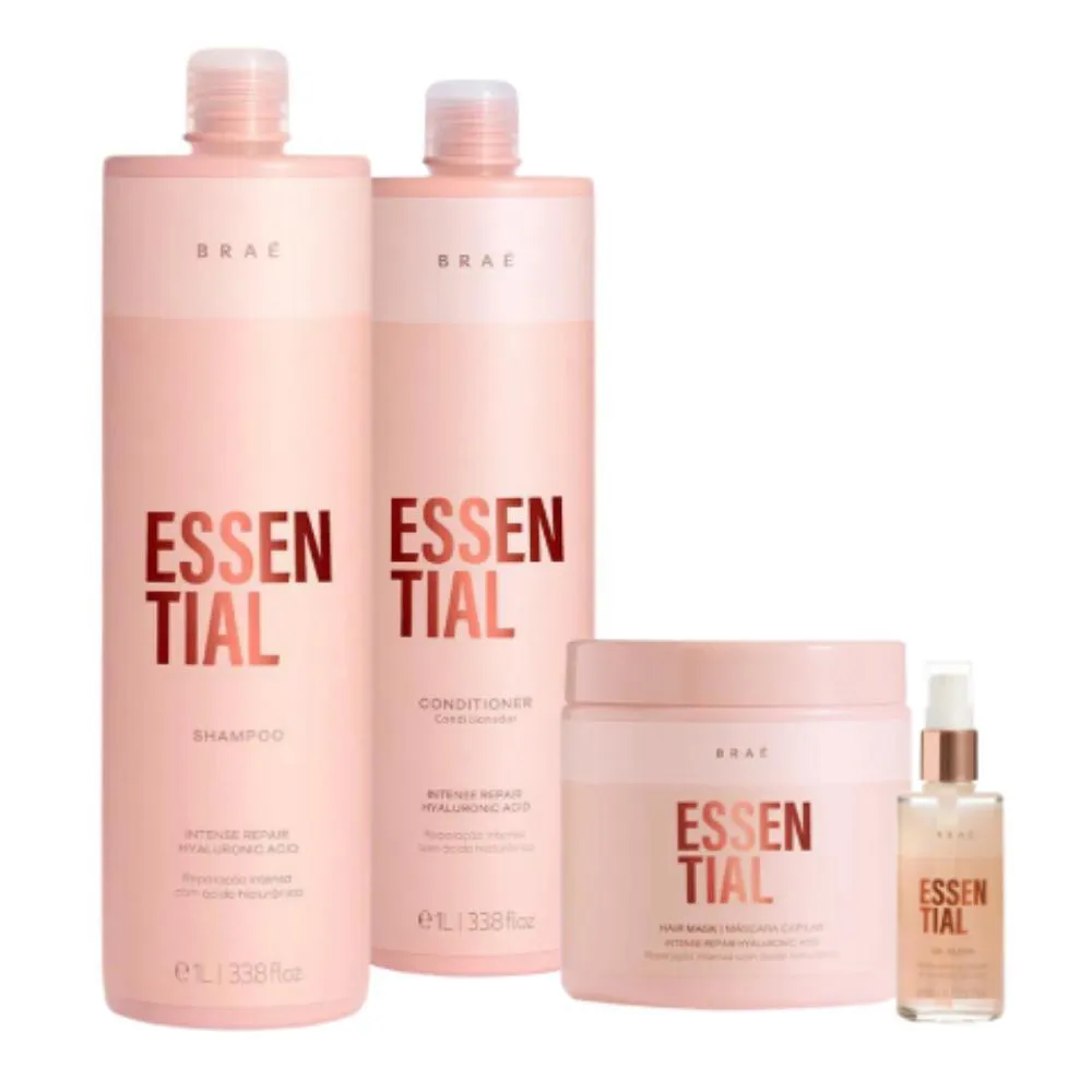 Braé Essential condicionador 1L: Possui ação de nutrição e reparação, promove hidratação progressiva e protege o cabelo contra agressões diárias e térmicas. Com ácido hialurônico, aminoácidos e complexo de óleos, os cabelos ficam macios e com brilho. Possui proteção térmica.