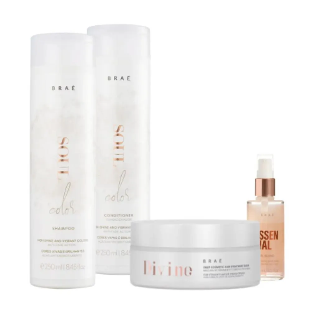 Brae Soul Color Máscara 200g: Essa máscara capilar é um tratamento intensivo para cabelos coloridos. Ela contém ingredientes que ajudam a reparar e fortalecer os fios, proporcionando hidratação profunda e revitalização. A máscara ajuda a manter a cor vibrante, enquanto melhora a textura, o brilho e a maleabilidade do cabelo. Esse kit é composto por: ● Braé Brae Soul Color Shampoo 250ml; ● Essential Oil Blend 60ml; ● Brae Soul Color Condicionador 250ml; ● Brae Soul Color Máscara 200g.