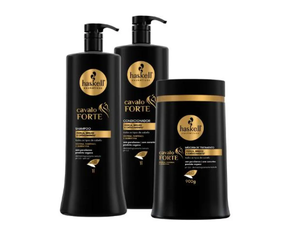 tratamento capilar profundo e concentrado que promove uma reconstrução intensiva dos fios. Com sua fórmula rica em queratina, aminoácidos e outros nutrientes essenciais, a máscara fortalece a estrutura capilar, restaura a elasticidade e ajuda a prevenir a quebra dos cabelos. Também proporciona hidratação duradoura, deixando os cabelos mais brilhantes, macios e saudáveis. Esse kit é composto por: ● Haskell Shampoo Cavalo Forte 1L; ● Haskell Condicionador Cavalo Forte 1L; ● Haskell Máscara Cavalo Forte 900g.