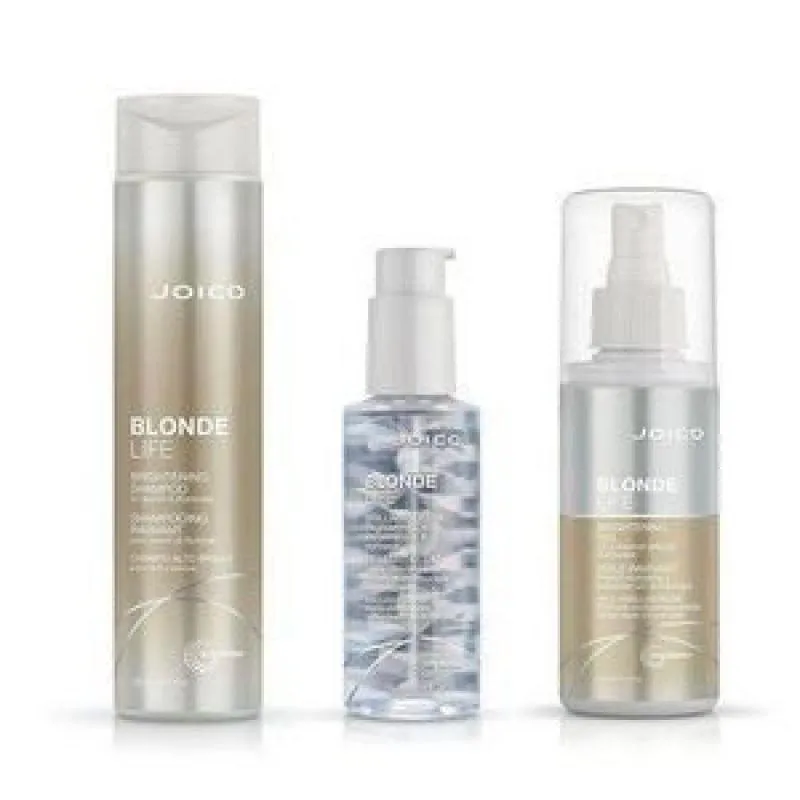shampoo 300ml: Shampoo iluminador para cabelos loiros. Joico Blonde Life Brightening Shampoo une limpeza suave, proteção da cor, nutrição e brilho intenso. Para ter a cor tão sonhada sem comprometer a saúde dos fios. - Joico Blonde Brilliant Life Glow Brightening Oil 100ml: Óleo capilar indicado para cabelos loiros. Proporciona um brilho incrível de forma instantânea, além de combater o