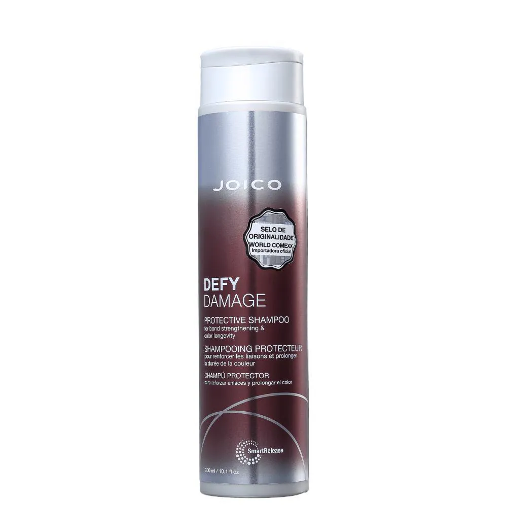 shampoo para todos os tipos de cabelo, principalmente os coloridos. Shampoo Joico Defy Damage Protective protege a cor, dá brilho e maciez para os fios de maneira intensa. O Shampoo Defy Damage, de Joico, possui uma fórmula especial que previne danos à fibra capilar e produz uma espuma luxuosa que higieniza de maneira extremamente delicada, sem desgastar a cor. Conta com ativos antioxidantes e protetores que garantem um fio saudável, maleável e luminoso.