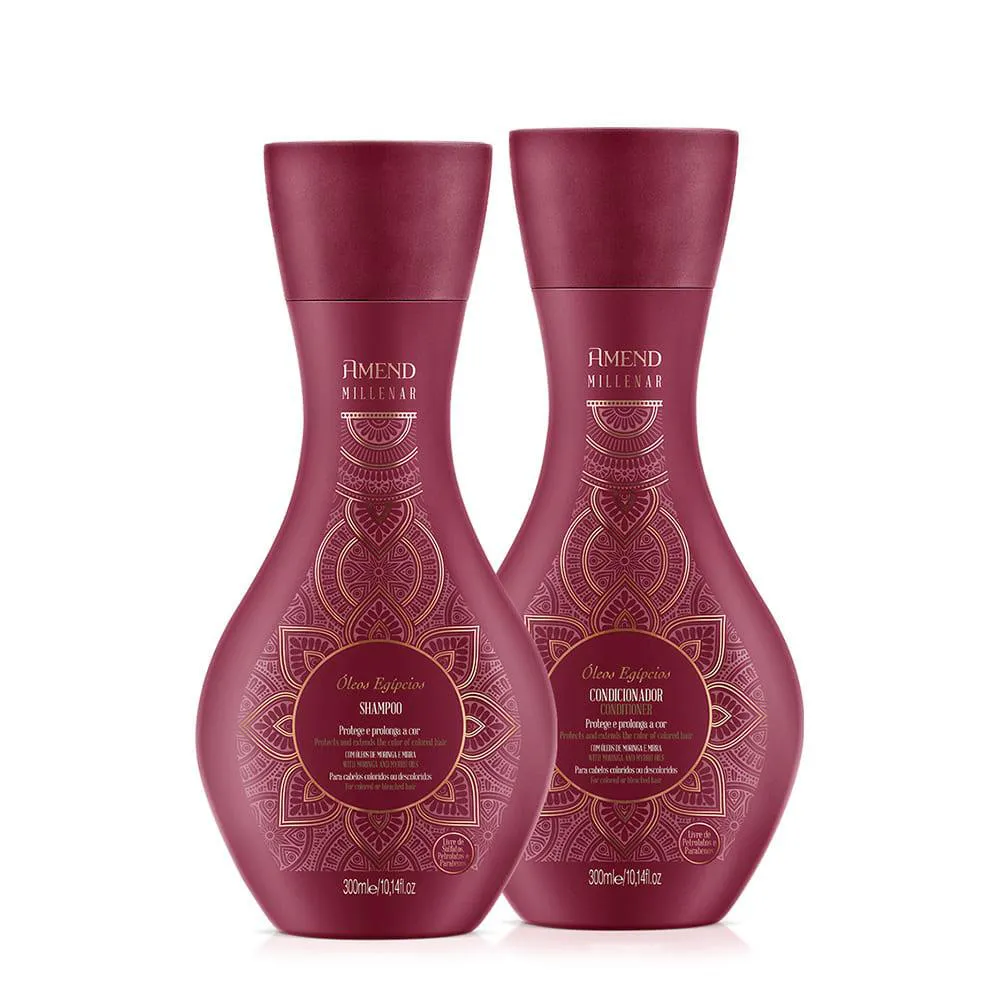Esse Kit Contém Amend Millenar Óleos Egípcios - shampoo 300ml: Para cabelos coloridos e descoloridos ajuda a manter o pigmento dentro do fio para evitar o desbotamento. Sua limpeza é suave, não compromete a cor. O Shampoo Millenar Óleos Egípcios, da Amend, também nutre o