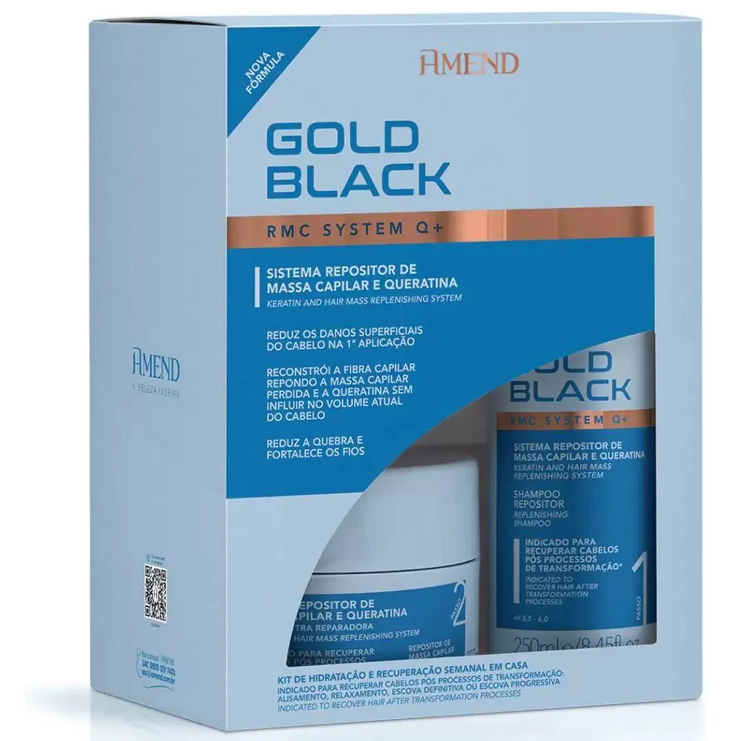 CARACTERÍSTICAS Kit Amend Gold Black Repositor de Massa Capilar e Queratina possui fórmula o revolucionário RMC system enriquecido com queratina hidrolisada. Ideal para a reestruturação a reconstrução interna e externa dos fios processos quimicamente, o sistema repositor de massa capilar e queratina gold black repõe a massa substantiva perdida dos cabelos, atua de forma inteligente em todas as fases da cutícula e do córtex, devolvendo a resistência e condição original da fibra capilar. Reduz 65% dos danos superficiais do cabelo na 1ª aplicação, reduz a quebra dos fios, reconstrói a fibra capilar repondo 90% da massa capilar perdida e a queratina sem influir no volume atual do cabelo, aumenta o brilho e a maciez instantaneamente. Ideal para reestruturação e reconstrução interna e externa dos cabelos com: alisamento, relaxamento, escova definitiva ou escova progressiva. Peso:
