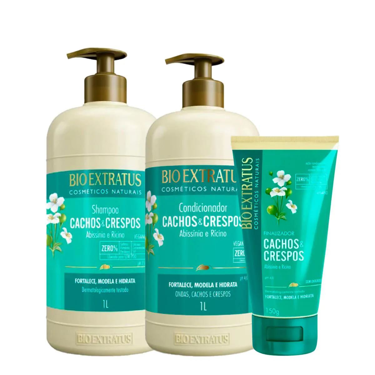 Kit Bio Extratus Cachos & Crespos Abissínia e Rícino shampoo condicionador e Finalizador (3 produtos)