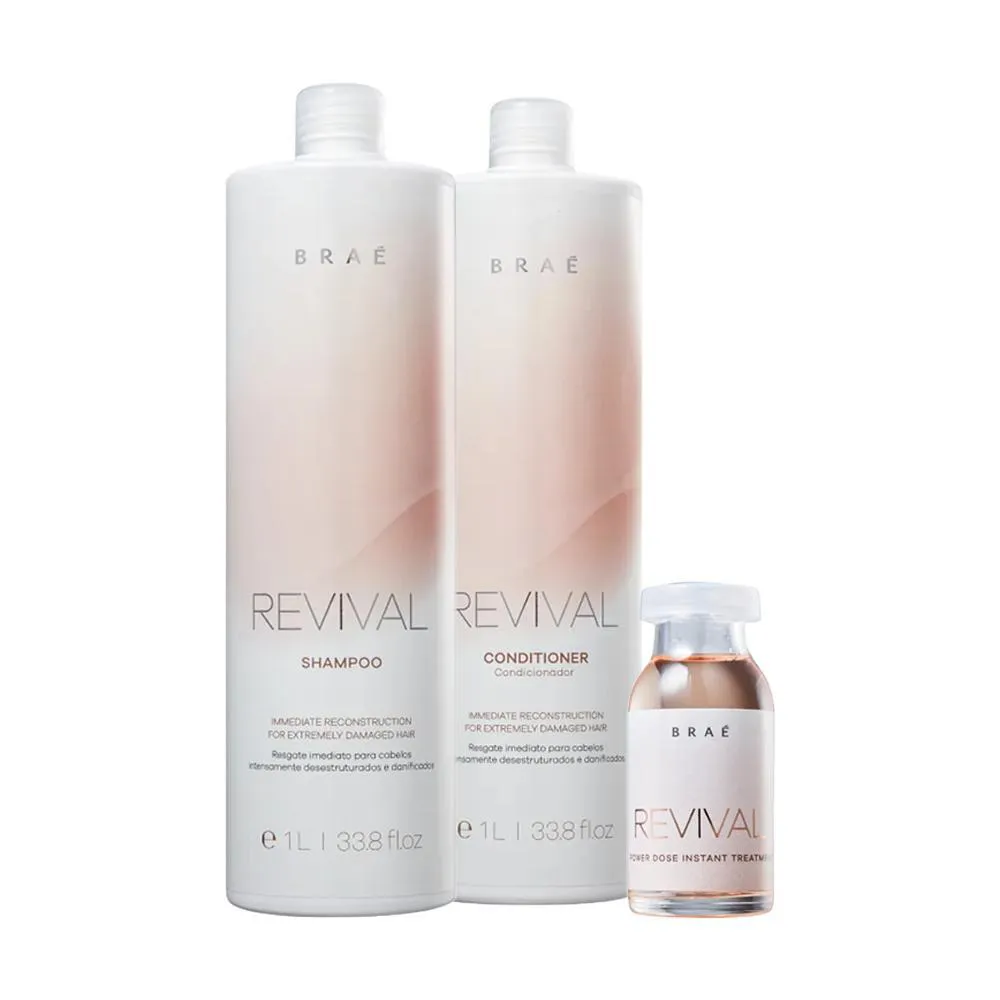 condicionador 1L, Ampola de tratamento 13ml (3 produtos) O kit BRAÉ Revival é um conjunto de produtos projetados para revitalizar e cuidar dos cabelos. O kit inclui três itens: BRAÉ Revival Shampoo (1L), BRAÉ Revival Condicionador (1L) e BRAÉ Revival Ampola de Tratamento (13ml). O BRAÉ Revival Shampoo é um shampoo de limpeza suave que remove impurezas e resíduos dos cabelos. Ele promove uma limpeza eficaz, ao mesmo tempo em que preserva a