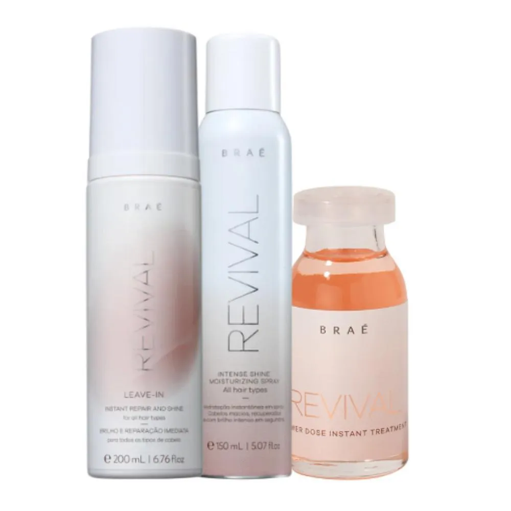 tratamento 13ml (3 produtos) O BRAÉ Kit Travel Size é um conjunto de produtos em tamanho de viagem que proporcionam brilho e revitalização aos cabelos. O kit inclui três itens: BRAÉ Revival Shine Spray (100ml), BRAÉ Leave In (200ml) e BRAÉ Ampola de Tratamento (13ml). O BRAÉ Revival Shine Spray é um spray de brilho que proporciona luminosidade instantânea aos cabelos. Ele ajuda a reduzir o