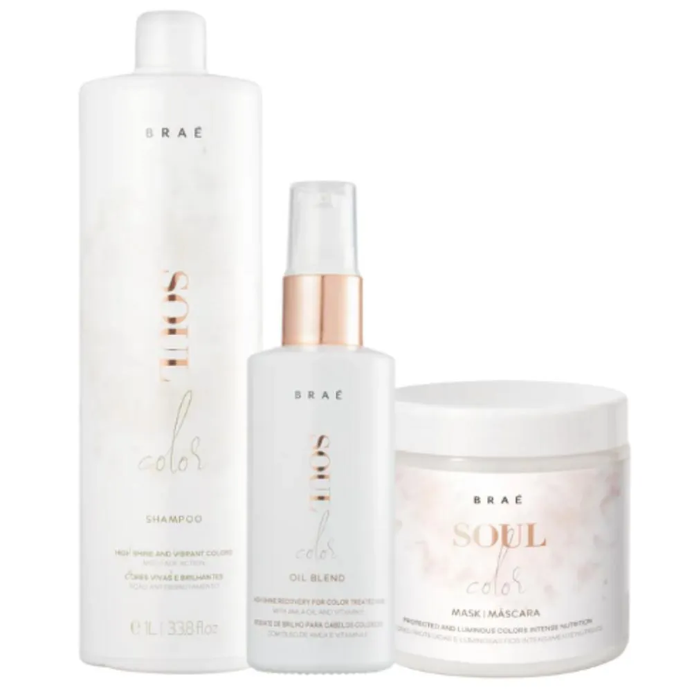 hidratação e brilho aos cabelos. O kit inclui três itens: BRAÉ Soul Oil Blend (60ml), BRAÉ Soul Shampoo (1L) e BRAÉ Soul Máscara (500g). O BRAÉ Soul Oil Blend é um óleo capilar que contém uma mistura de óleos nutritivos e reparadores. Ele ajuda a revitalizar os fios, proporcionando hidratação intensa e nutrição profunda. O óleo capilar também ajuda a controlar o