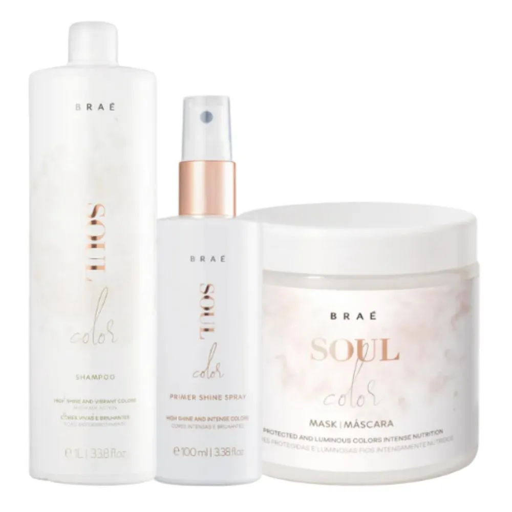 shampoo 1L, Máscara 500g (3 produtos) O kit BRAÉ Soul Color é um conjunto de produtos desenvolvidos para cuidar e realçar a cor dos cabelos. O kit inclui três itens: BRAÉ Soul Color Primer Spray (100ml), BRAÉ Soul Color Shampoo (1L) e BRAÉ Soul Color Máscara (500g). O BRAÉ Soul Color Primer Spray é um spray preparatório que cria uma camada protetora nos cabelos antes da aplicação da coloração. Ele ajuda a proteger os fios, minimizando danos e desbotamentos, além de facilitar a distribuição uniforme da cor. O primer spray também auxilia na fixação da coloração, proporcionando resultados mais duradouros. O BRAÉ Soul Color Shampoo é um shampoo especialmente formulado para cabelos coloridos. Ele limpa suavemente os fios, removendo impurezas e resíduos sem comprometer a cor. O shampoo ajuda a proteger a cor dos cabelos, evitando o desbotamento e mantendo a intensidade e o brilho da cor por mais tempo. Além disso, ele contribui para a