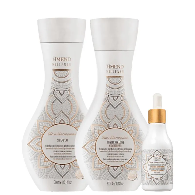condicionador AMEND MILLENAR ÓLEOS MARROQUINOS 300ML Condicionador Amend Millenar Óleos Marroquinos inspirados nos ingredientes usados há milênios no Marrocos para os cuidados da beleza, desenvolvemos um condicionador que delicadamente proporciona condicionamento intenso, efeito suavizante, maciez, elasticidade e hidratação aos fios, através da rica combinação dos óleos marroquinos e do potente ativo protetor e disciplinante extraído do Tamarindo. ELIXIR AMEND MILLENAR ÓLEOS MARROQUINOS 75G Elixir Amend Millenar Óleos Marroquinos inspirados nos ingredientes usados há milênios no Marrocos para cuidados com a beleza. Delicadamente proporciona efeito suavizante, maciez, elasticidade e hidratação aos fios, por meio da rica combinação dos óleos marroquinos, agindo na superfície dos fios, para deixá-los uniformes, bem alinhados e livres do