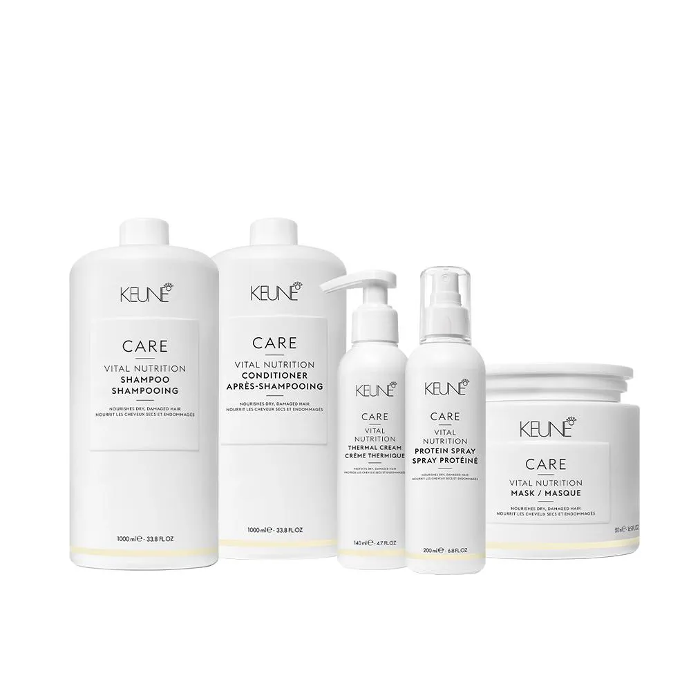 Kit Keune Care Vital Nutrition shampoo condicionador Litro Máscara Thermal Protein (5 produtos) Este Kit Contém Keune Care Vital Nutrition ? Shampoo 1L: recomendado para cabelos secos, porosos e danificados, o Care Vital Nutrition Shampoo limpa, hidrata e dá leveza aos fios, especialmente aqueles que receberam recentemente mechas ou descoloração. Isso porque sua fórmula é rica em