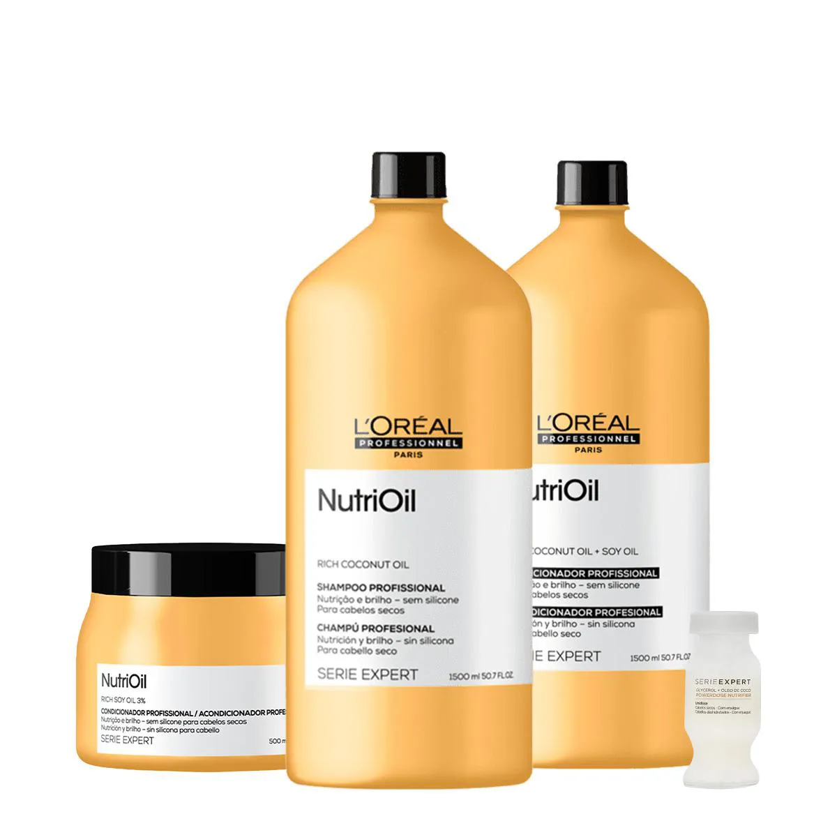 Este Kit Contém L'Oréal Professionnel Serie Expert NutriOil - Shampoo 1,5L: shampoo para cabelos ressecados possui textura leve que promove a dose certa de nutrição sem pesar os fios.