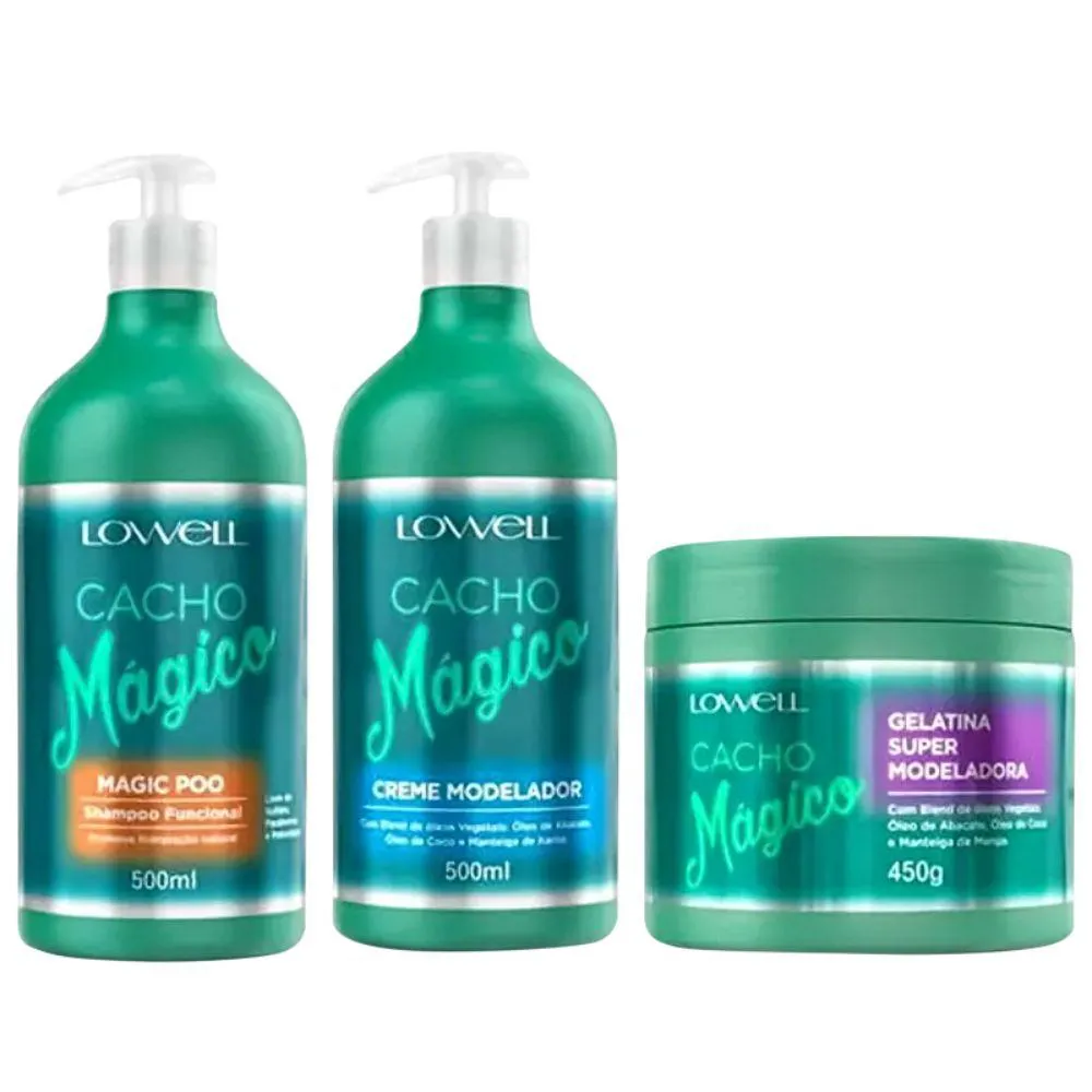 O que é:Kit Lowell Cacho Mágico - shampoo 500ml + Creme 500ml + Gelatina 450g