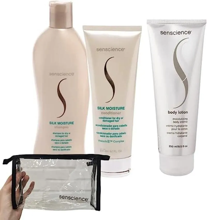 01 Necessaire Senscience Shampoo Silk Moisture: Shampoo para cabelos secos ou danificados, Senscience Silk Moisture limpa e hidrata gentilmente e completamente seus cabelos secos ou danificados. Senscience Silk Moisture também fortalece e recupera os danos causados ??pela agressão de ferramentas térmicas (