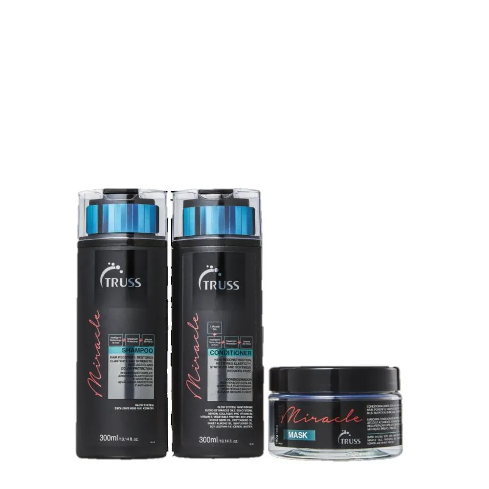 Resultados: Ao seguir o Conselho de Aplicação, seus cabelos revelarão uma transformação triplicada. O Shampoo Miracle proporcionará uma limpeza eficaz, preparando os fios para os cuidados subsequentes. O Condicionador Miracle restaurará a maciez e o brilho, conferindo um condicionamento excepcional. A Máscara Miracle, com sua reconstrução intensiva, deixará seus cabelos profundamente nutridos e revitalizados. Desfrute da tríade perfeita para cabelos deslumbrantes com o Kit Truss Miracle Triplo.