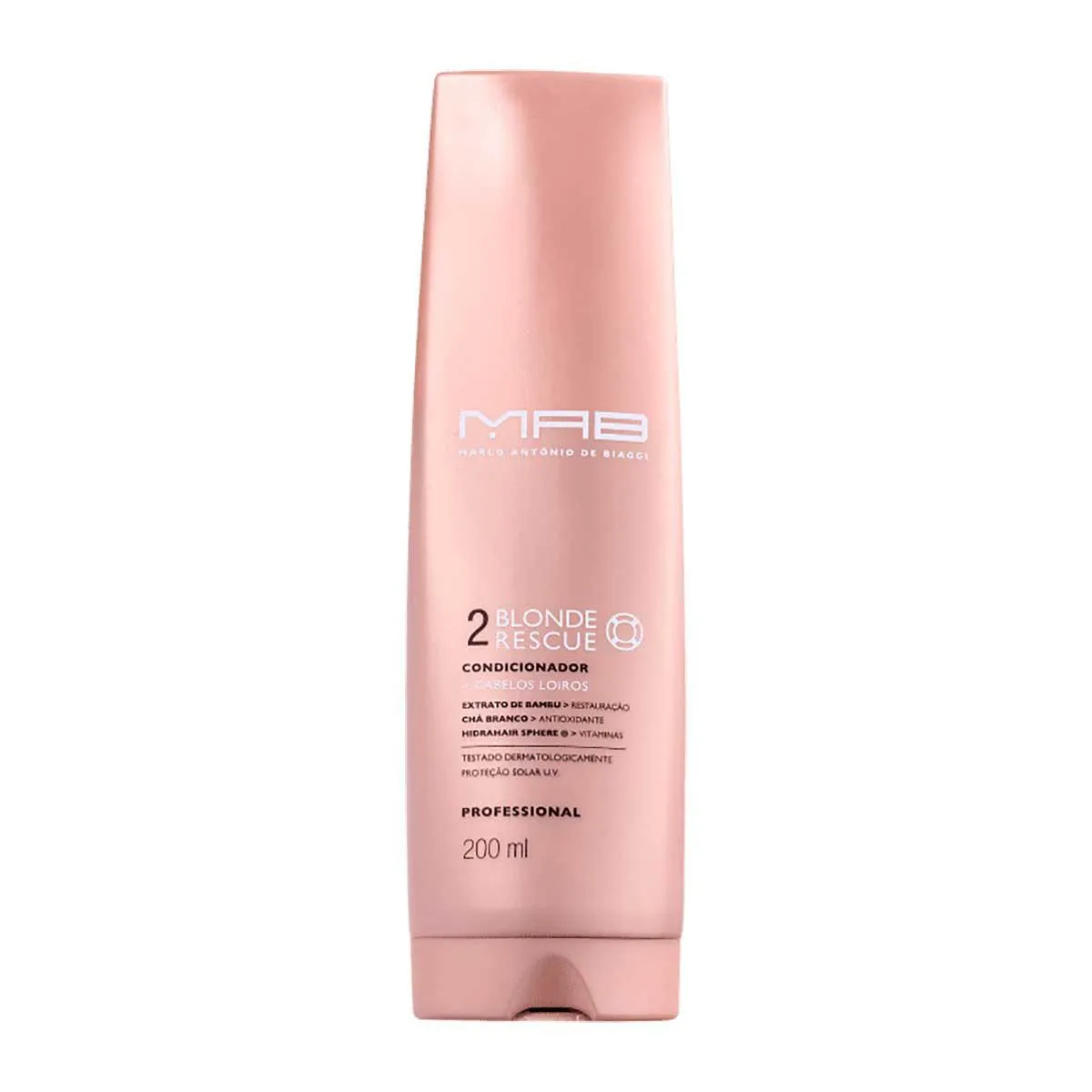 MAB Marco Antônio de Biaggi Blond Rescue condicionador traz ativos que hidratam, nutrem e reestruturam a fibra capilar. MAB Marco Antônio de Biaggi Blond Rescue Condicionador confere brilho, maciez e saúde aos fios danificados pela química enquanto desembaraça e facilita o pentear. Possui Hidrahair Sphere, ativo composto de microesferas catiônicas que liberam gradual e seletivamente vitaminas essenciais ao tratamento dos fios, reconstituindo pontas secas, duplas, mantendo a coloração natural e o brilho dos cabelos, associadas ao extrato concentrado de algas vermelhas que possui ação reestruturante das cutículas capilares.