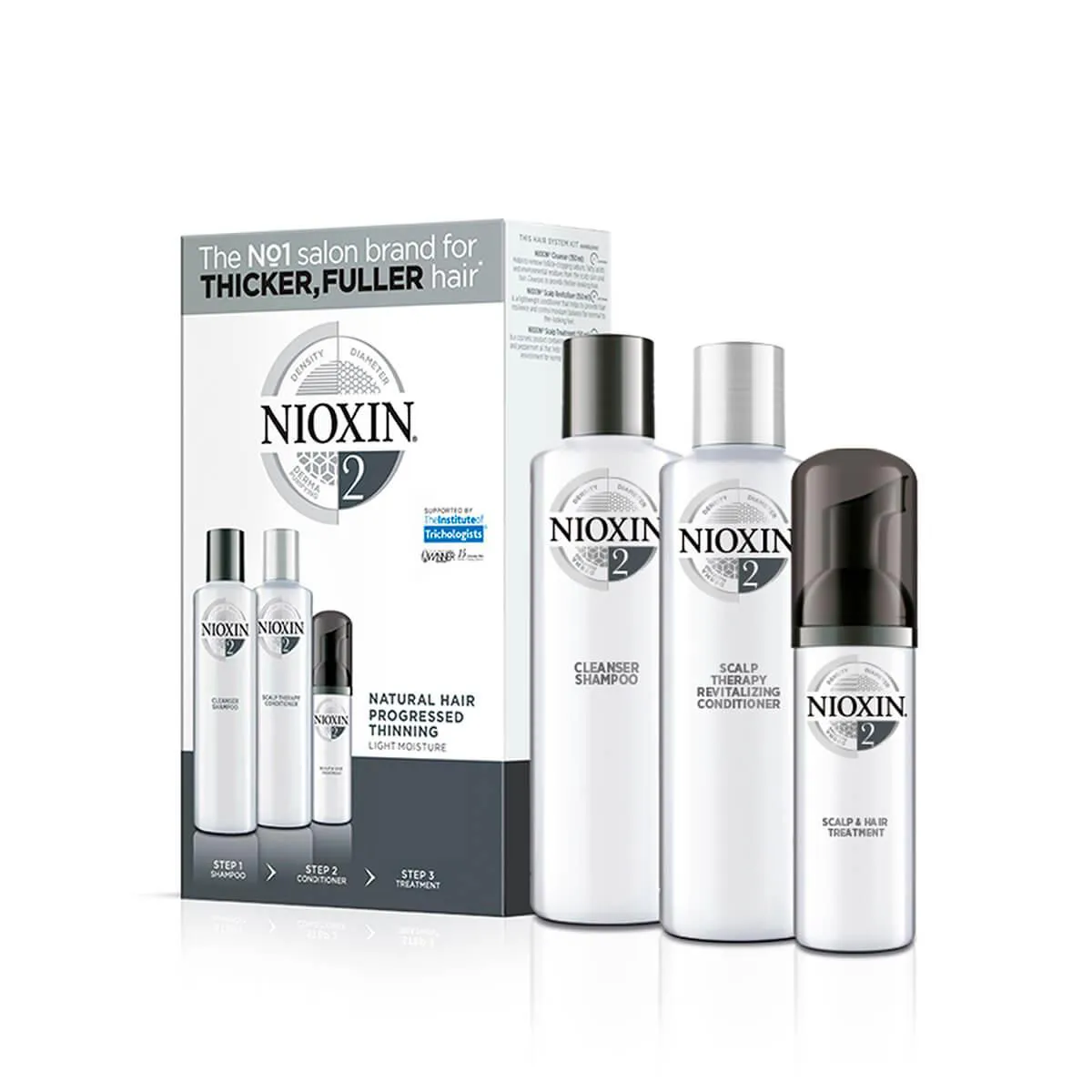 O que é: Nioxin Sistema de 3 Partes Kit Sistema 2 para Cabelos Naturais com Rarefação Capilar Avançada para conquistar cabelos mais volumosos. Este kit contém três produtos profissionais para cuidados com os cabelos limpa, otimiza e trata o couro cabeludo e os cabelos.