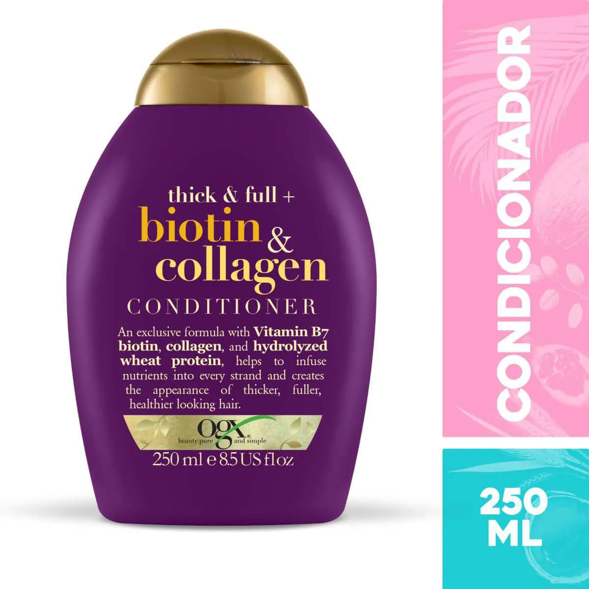 O que é: O condicionador OGX Biotin & Collagen possui em sua fórmula Biotina (Vitamina B12) e Colágeno, poderosos ativos que ajudam a dar volume e textura a qualquer tipo de fio.
