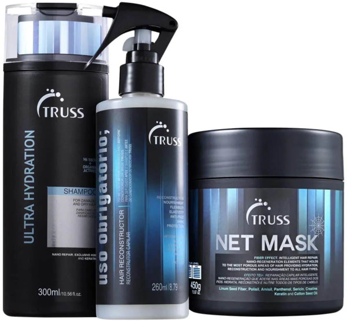 shampoo 300ml: Restaura a hidratação com a selagem das cutículas e repara danos. Truss Uso Obrigatório - Tratamento Reconstrutor 260ml: Recupera o aspecto saudável do cabelo danificado e quimicamente tratado. Truss Net - Máscara Capilar 550g: promove uma nano reposição de massa que restaura a elasticidade e força.