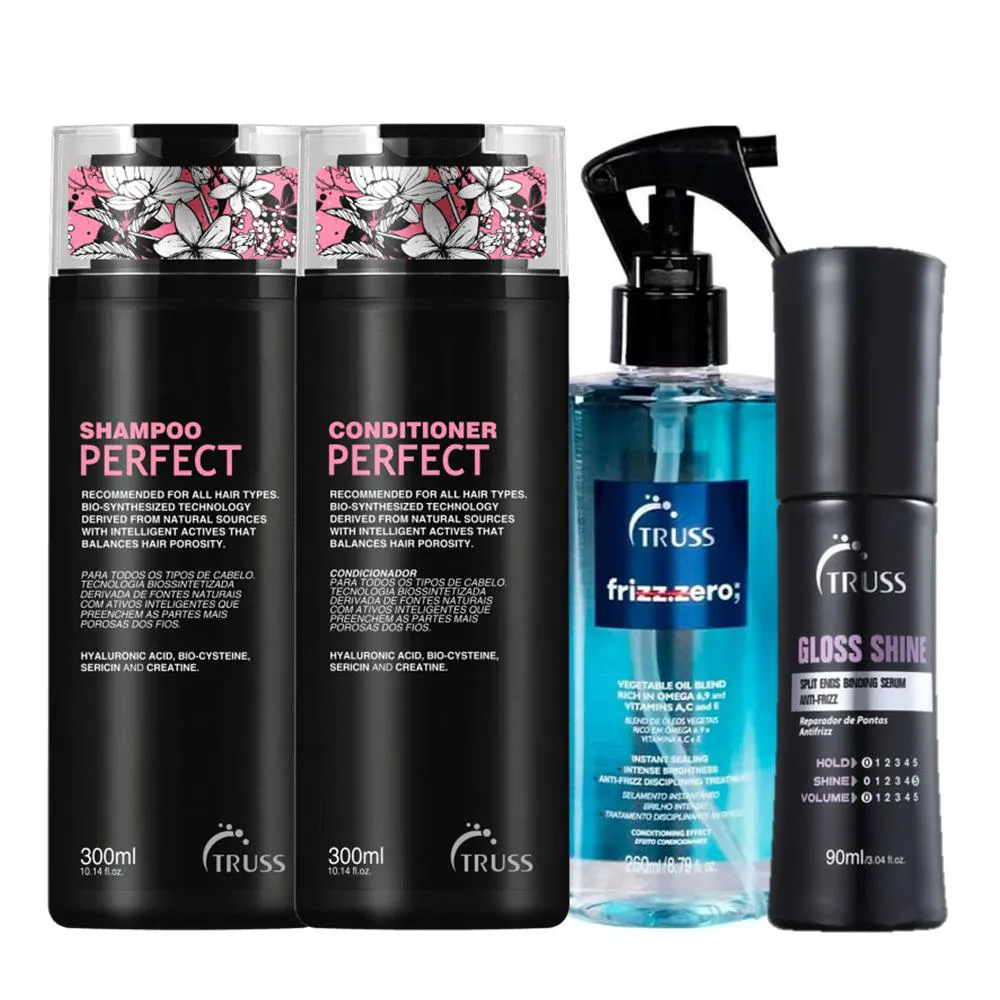 Kit Truss Perfect hidrata e ajuda no resgate da elasticidade e da resistência, além de impedir a formação do frizz. Sua embalagem conta com estampas exclusivas criadas pelo estilista Alexandre Herchcovitch.