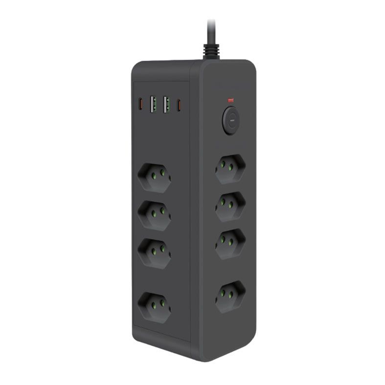 Conta com 8 tomadas padrão, permitindo conectar múltiplos equipamentos simultaneamente com organização e praticidade. Ideal para setups completos, escritórios e ambientes que exigem alta demanda de conexões.