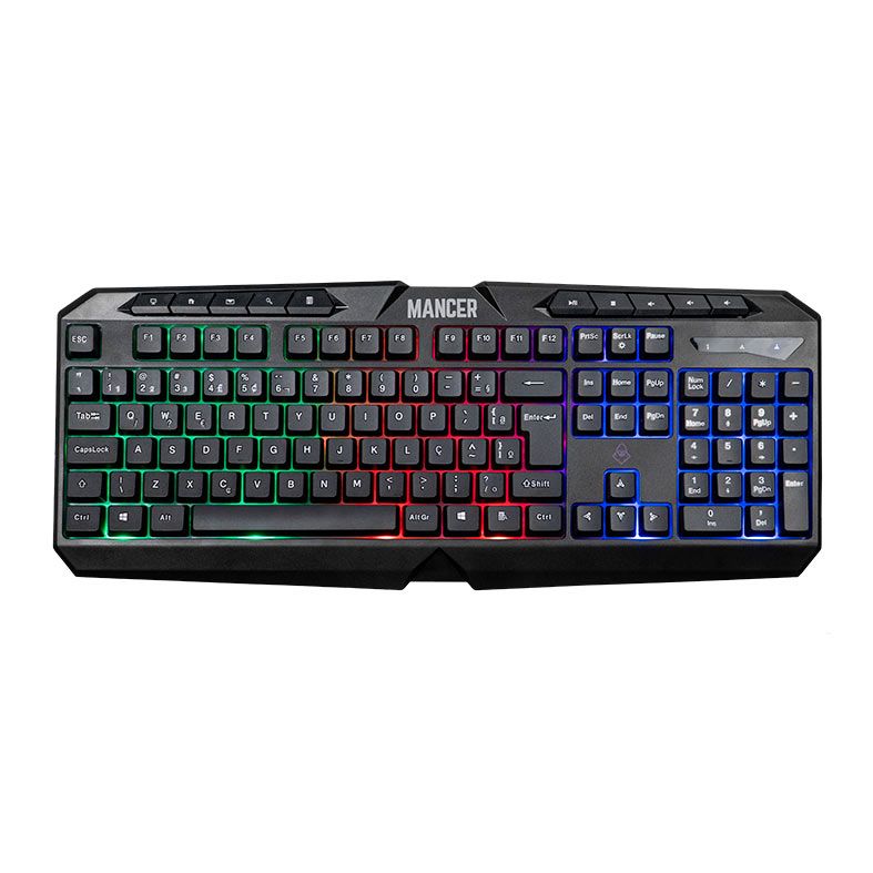O kit Mancer Krinus conta com iluminação Rainbow! Tanto o teclado quanto o mouse possuem a retroiluminação, tendo opção de luz estática ou efeito de respiração, trazendo não apenas beleza, como também uma fácil visualização das teclas em ambientes escuros.