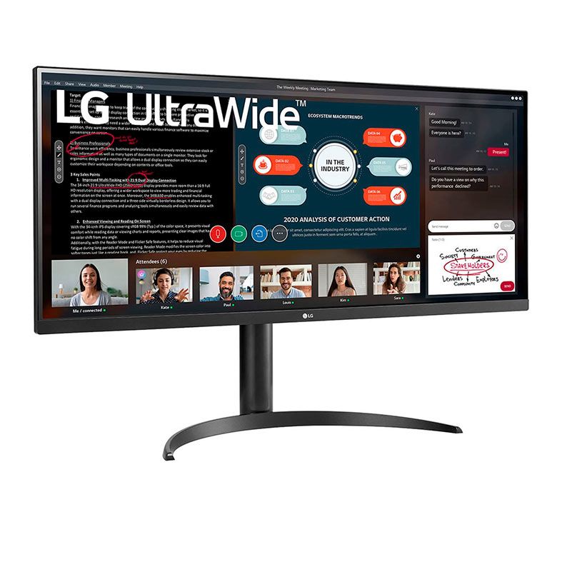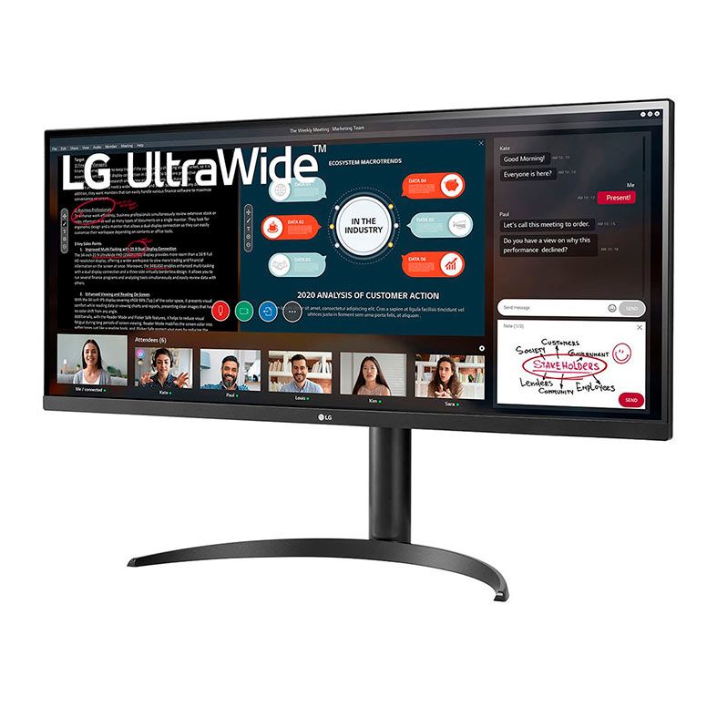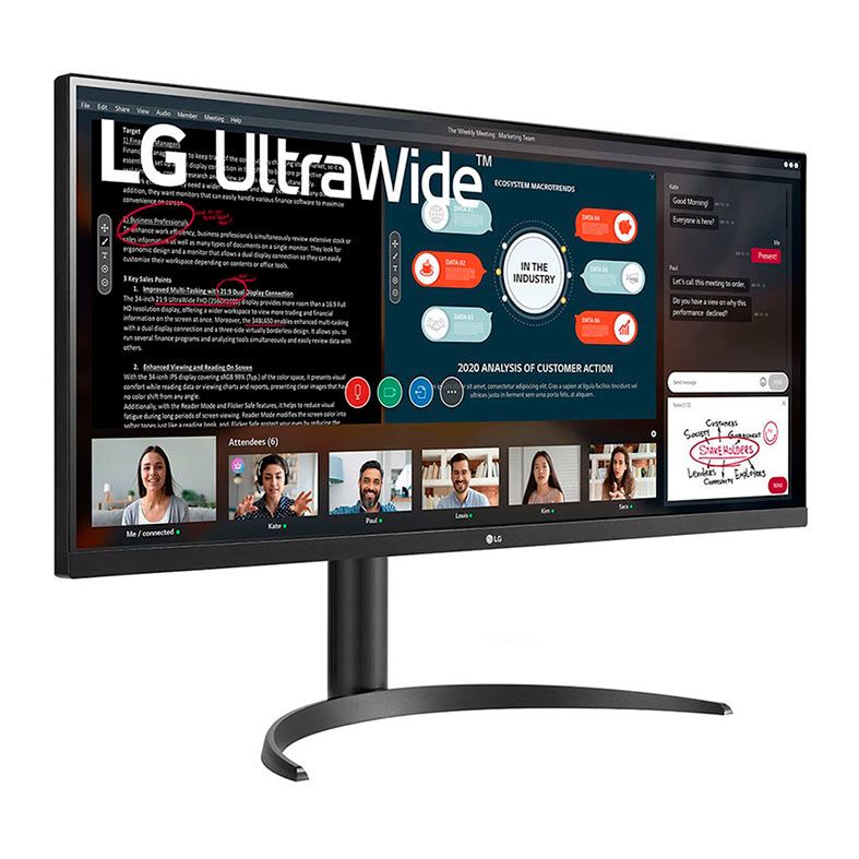 O monitor LG UltraWide™ 21:9 tem resolução Full HD (2560x1080) e oferece 33% mais espaço de tela comparado a monitores convencionais. Aproveite a tela para ver mais relatórios de uma vez durante a video-chamada.