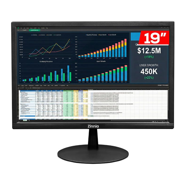 A tela de 19” entrega imagens com contraste 1000:1 e brilho de 200 cd/m², garantindo boa definição em diferentes condições de iluminação. Seu formato compacto permite maior aproveitamento do espaço, sem perder qualidade visual.
