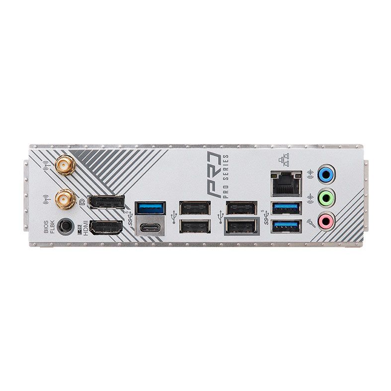 | Painel Traseiro: | 2 x Portas de antena 1 x Porta HDMI 1 x DisplayPort 1.4 3 x Portas USB 3.2 Gen1 tipo A 1 x Porta USB 3.2 Gen1 tipo C 4 x Portas USB 2.0 1 x Porta LAN RJ 45 1 x Botão BIOS Flashback Conectores de áudio HD: entrada de linha / alto-falante frontal / microfone |