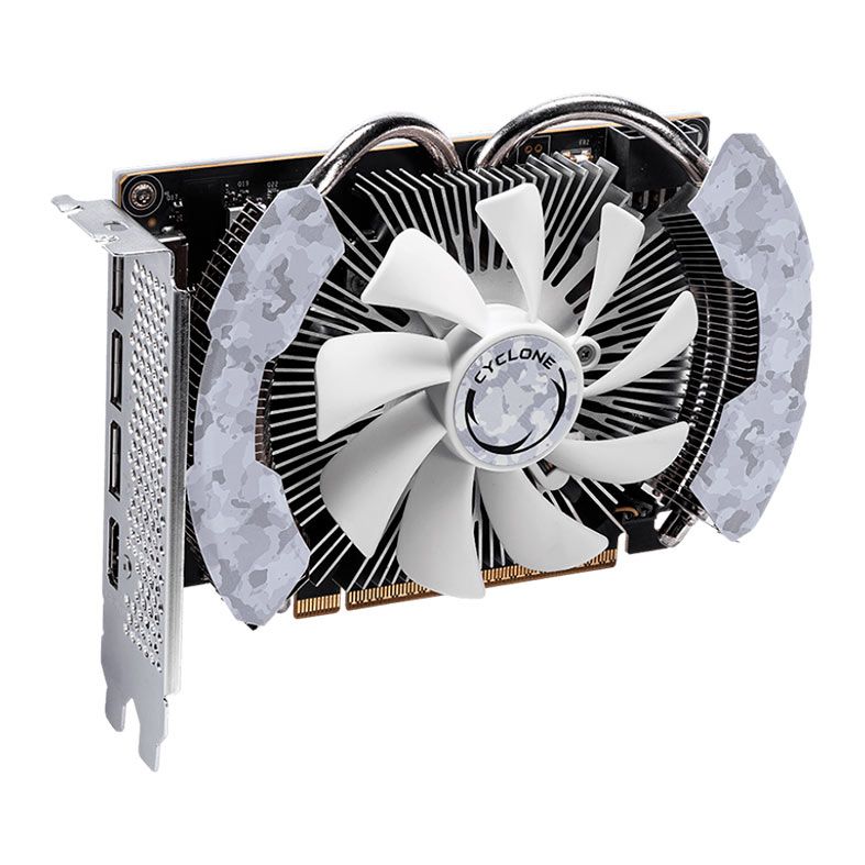 O conceito de refrigeração é inspirado na força de uma tempestade ciclônica, com um avançado radiador em alumínio extrudado no formato de girassol, aletas densas e dois heat pipes de alta eficiência que dissipam rapidamente o calor da GPU e dos componentes ao redor.