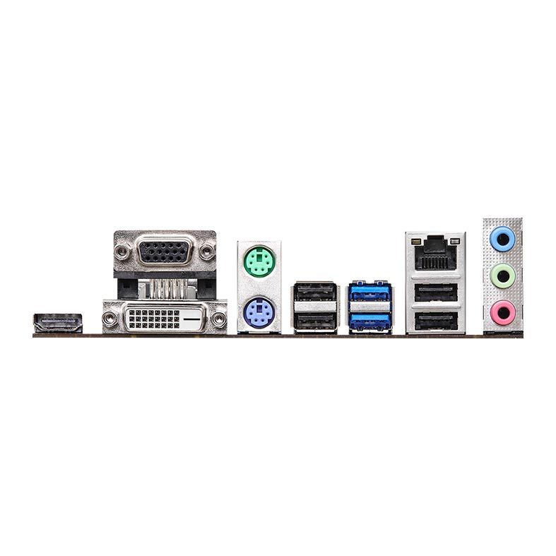 | Painel Traseiro: | 1 x Porta de teclado PS / 2 1 x Porta de mouse PS / 2 1 x Porta D-Sub 1 x Porta DVI-D 1 x Porta HDMI 4 x Portas USB 2.0 (suporta proteção ESD) 2 x Portas USB 3.2 Portas Gen1 (Suporta proteção ESD) 1 x Porta LAN RJ-45 com LED (LED ACT / LINK e LED SPEED) Conectores de áudio HD: Entrada de linha / Alto-falante frontal / Microfone |