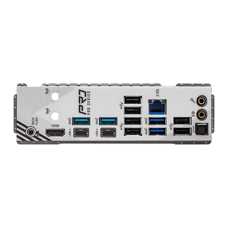 | Painel Traseiro: | - 2 x Pontos de Montagem da Antena - 1 x Porta HDMI - 1 x Porta de Saída Óptica SPDIF - 2 x USB4 Tipo-C Ports (40 Gb/s)* - 4 x USB 3.2 Gen1 Tipo-A Ports - 6 x portas USB 2.0 - 1 x Porta de Rede RJ-45 - 1 x Chave BIOS Flashback - 1 x Line Out Jack (Gold Audio Jack) - 1 x Microfone Input Jack (Gold Audio Jack) * Suporta carregamento USB PD 3.0 até 5V@3A (15W) |