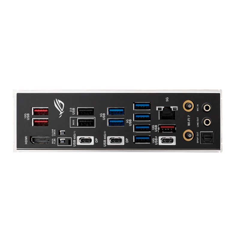 | Painel traseiro: | 2x Portas USB4® ( 40 Gbps) (2 portas USB Type-C® ) 4x Portas USB 10 Gbps (3 portas Type-A + 1 porta USB Type-C® com carregamento rápido PD/PPS de até 30 W)** 6x Portas USB 5 Gbps (6 portas Type-A) 2x Portas USB 2.0 (2 portas Type-A) 1x Porta HDMI™ 1x módulo Wi-Fi 1x Porta Ethernet Realtek 5 Gb 2x Conectores de áudio 1x Porta de saída óptica S/PDIF 1x Botão BIOS FlashBack™ 1x Botão Clear CMOS |