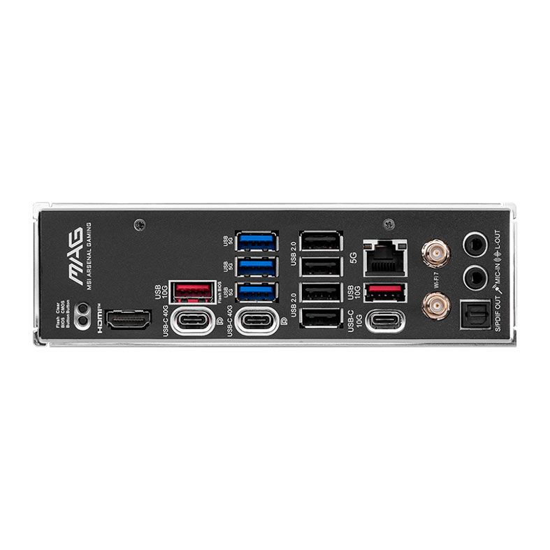 | Painel Traseiro: | 1 x Botão Limpar CMOS 2 x USB 10Gbps Tipo A 3 x USB 5Gbps Tipo A 4 x USB 2.0 1 x Rede 5G 1 x Wi-Fi / Bluetooth Conectores de áudio 1 x Botão Flash BIOS 1 x HDMI™ 2 x USB 40Gbps Tipo C 1 x USB 10 Gbps Tipo C |