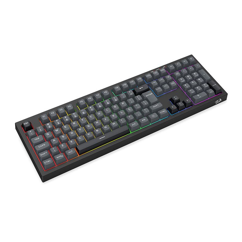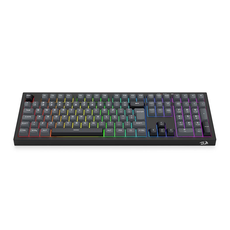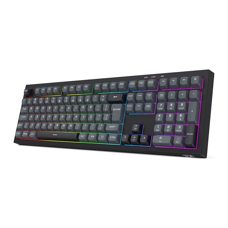 O Redragon Crux conta com keycaps personalizadas nas cores cinza e preta, que conferem ao teclado uma estética moderna e equilibrada. Essa combinação de tons neutros proporciona um visual elegante e diferenciado, destacando o design do equipamento sem comprometer a legibilidade.