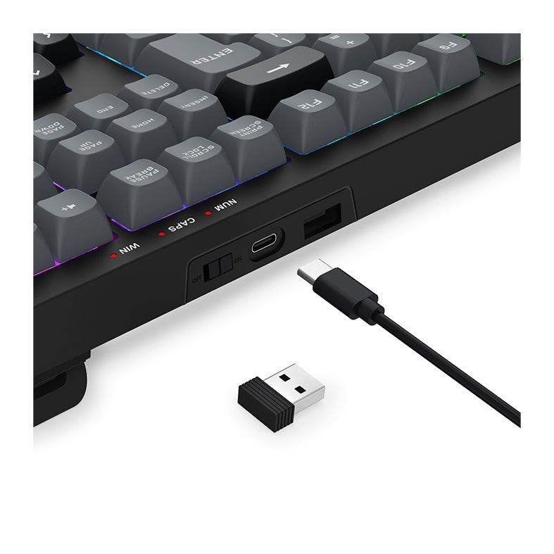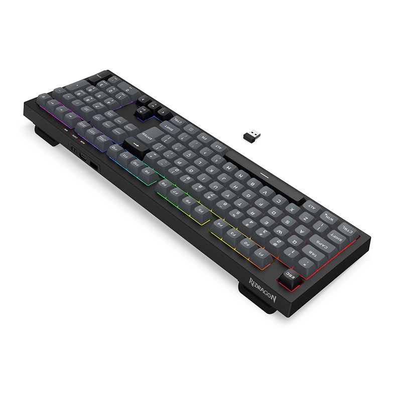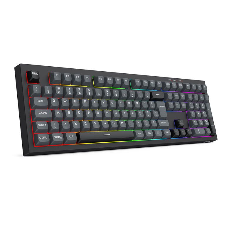 | Características: | Keycaps personalizadas na cor cinza e preta trazendo uma estética diferenciada. Layout ABNT2 feito especialmente para o mercado brasileiro. Tamanho full size para os usuários que não podem ficar sem o teclado numérico completo. Iluminação rainbow com vários efeitos ajustáveis. Pezinhos de elevação com 2 níveis para melhor conforto durante o uso. Espaço dedicado para armazenamento do receptor USB 2.4GHz. |