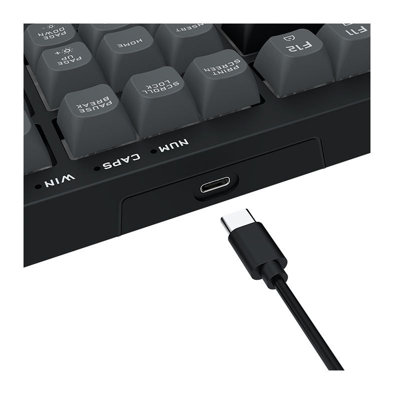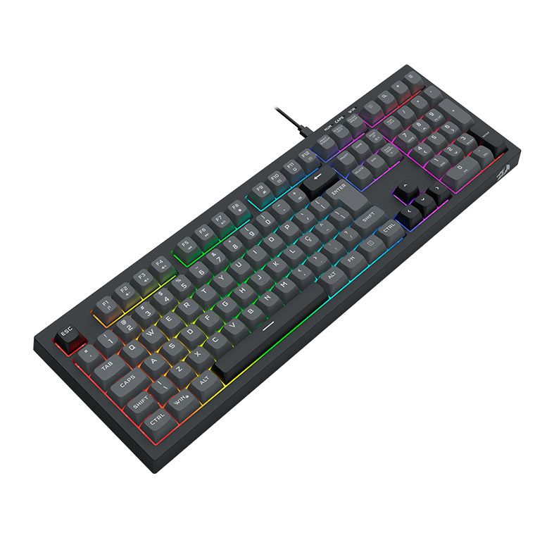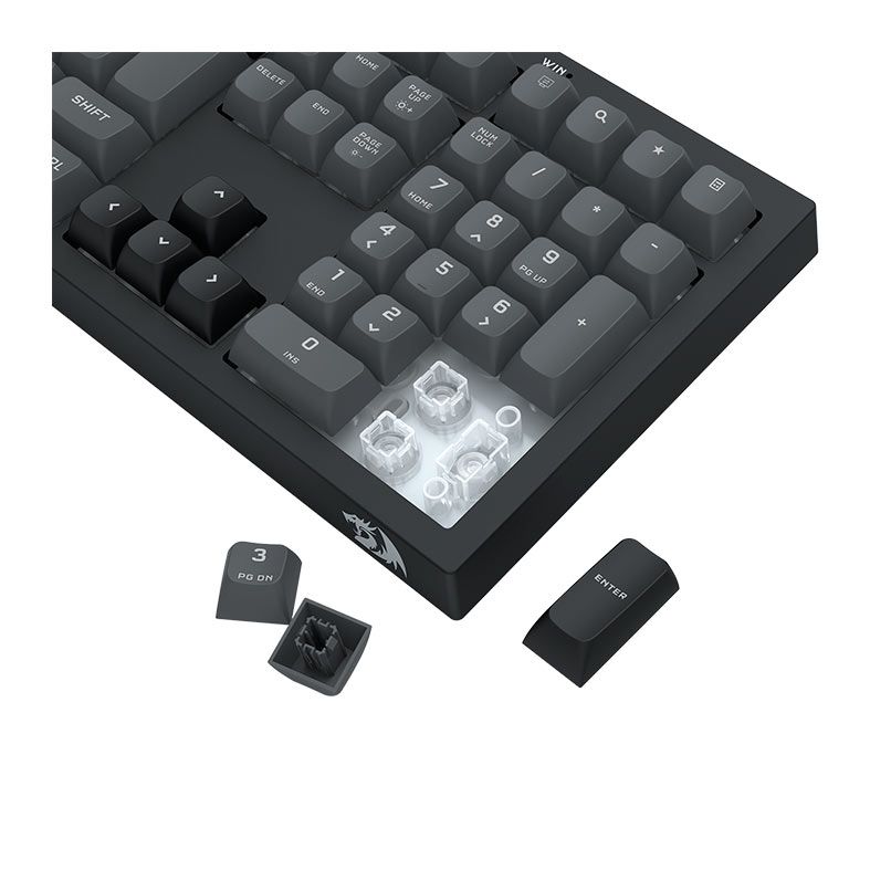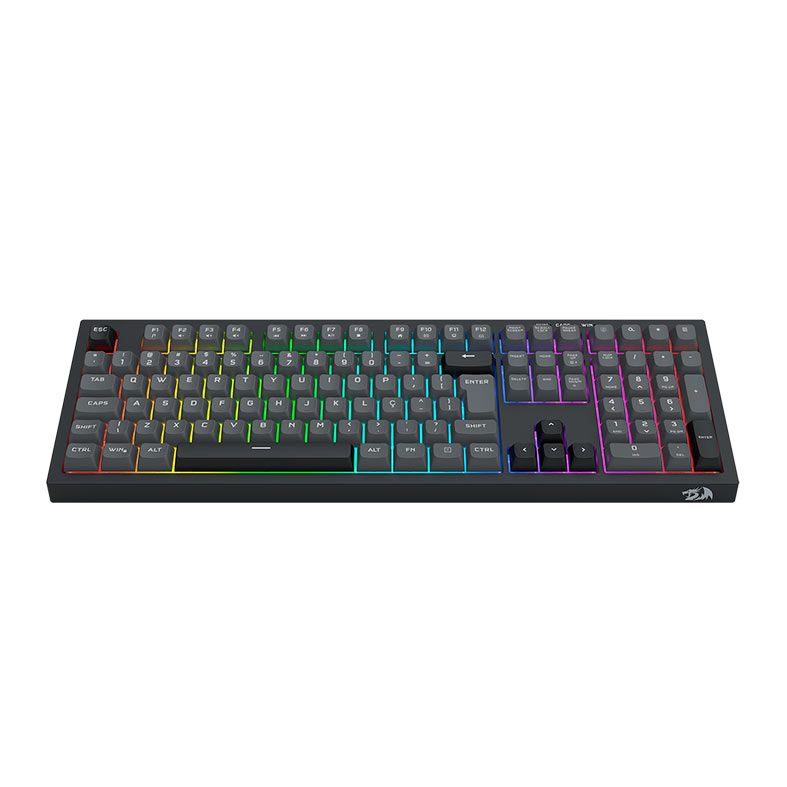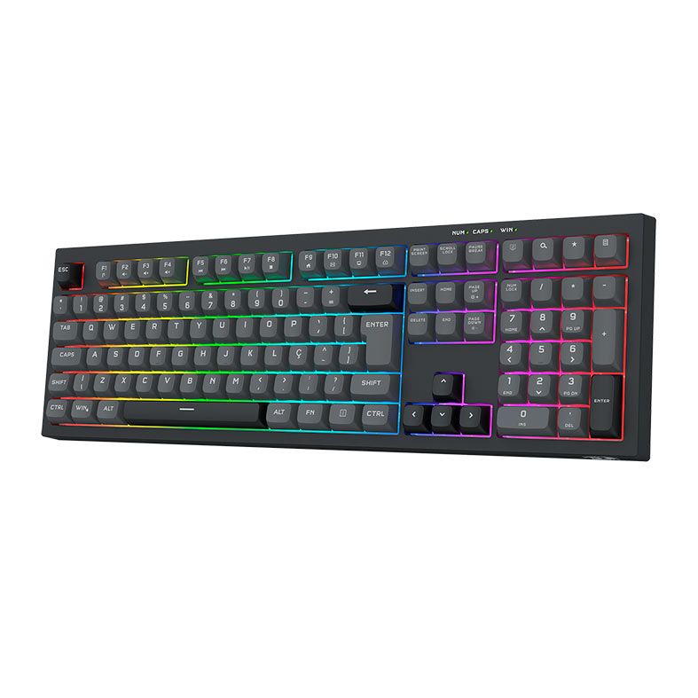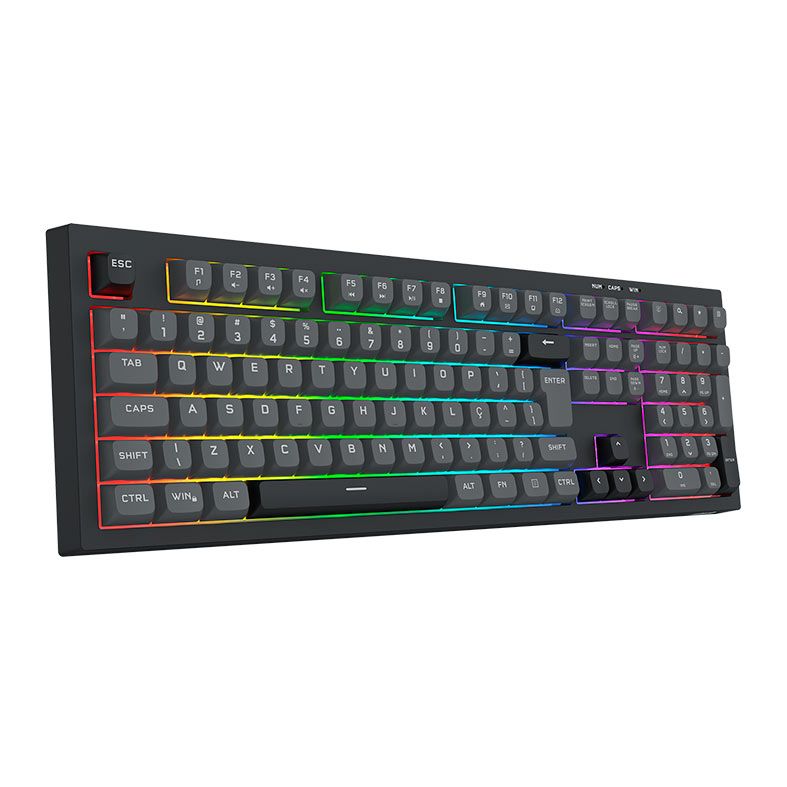 O Redragon Crux conta com keycaps personalizadas nas cores cinza e preta, que conferem ao teclado uma aparência moderna e minimalista. Essa combinação de tons neutros realça o design do equipamento e harmoniza facilmente com diferentes estilos de setup.