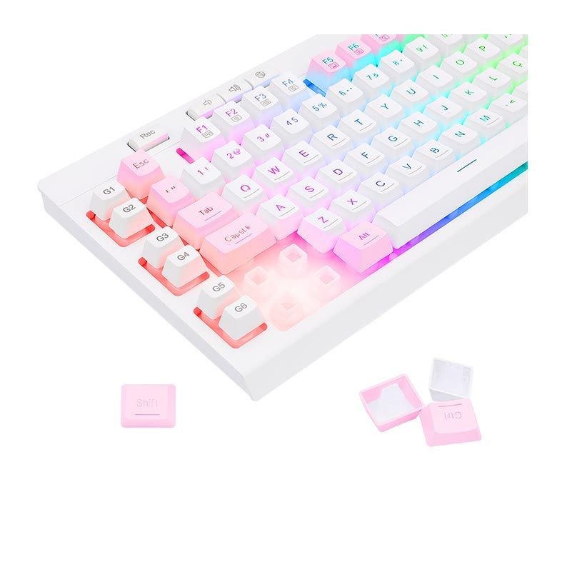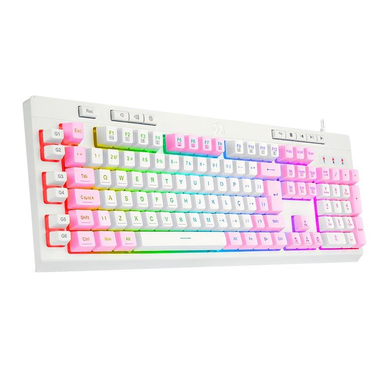 O Redragon Shiva Lollipop também conta com 8 teclas dedicadas para multimídia e 6 teclas programáveis para macro.