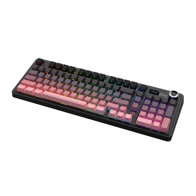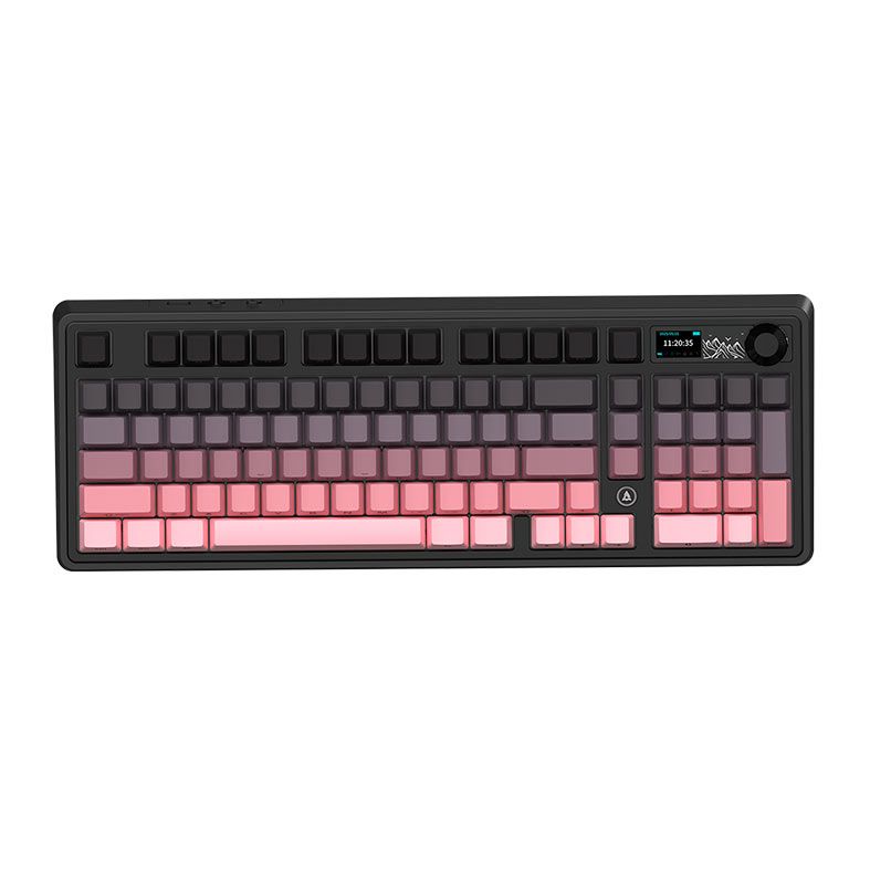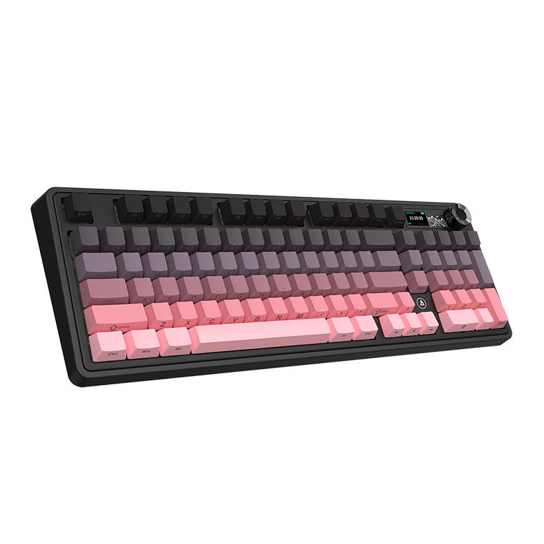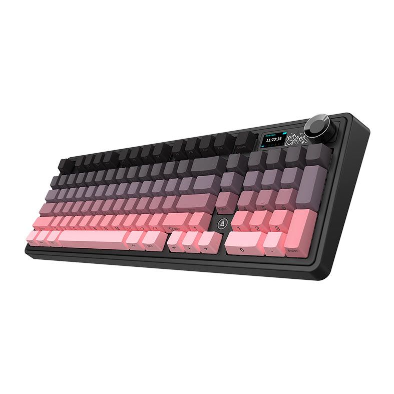 A tela embutida com botão rotativo permite ajustes rápidos e monitoramento direto no teclado, oferecendo controle prático e experiência moderna. Esse recurso une funcionalidade e tecnologia em um design premium.
