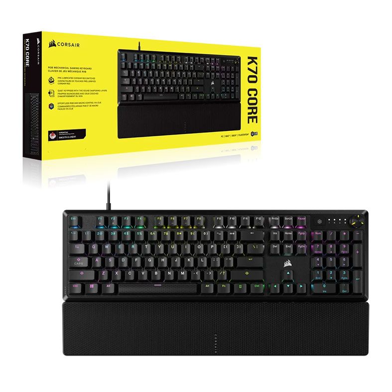 O teclado gamer CORSAIR K70 CORE possibilita sua melhor jogabilidade e torna os jogos e a digitação incríveis, com controle de mídia sem esforço e interruptores lineares CORSAIR MLX Red.