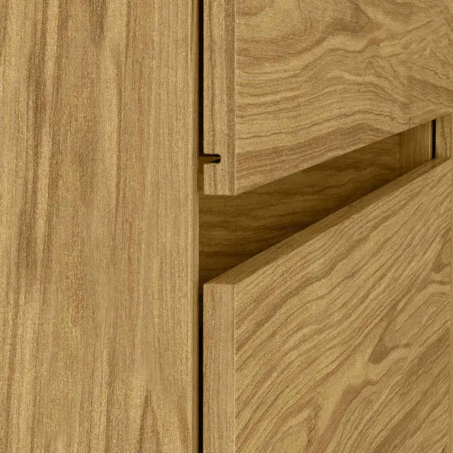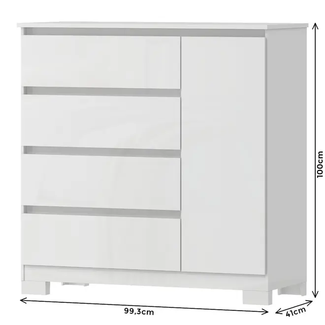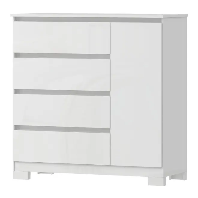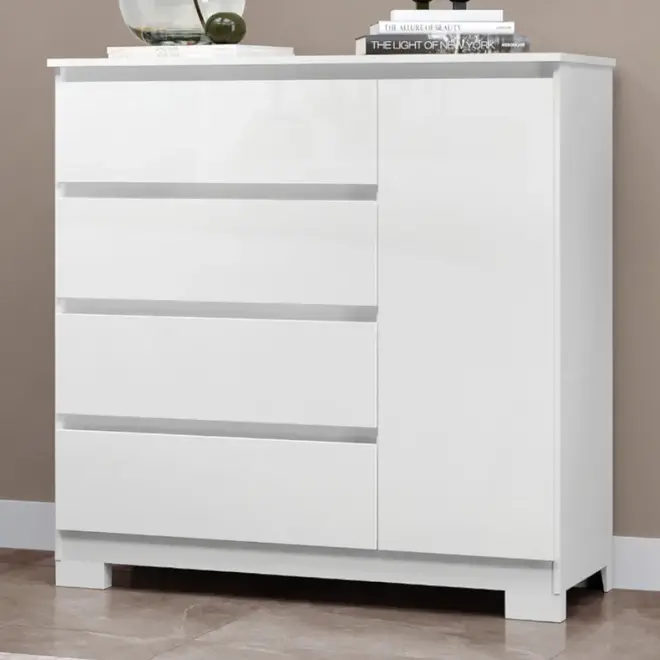 A Cômoda Vega conta com 4 gavetas amplas, todas com corrediças telescópicas, que garantem um deslizamento suave e seguro, facilitando o acesso aos seus pertences. Além disso, possui 1 porta lateral com 1 prateleira interna, ideal para guardar objetos maiores, roupas dobradas, calçados ou até itens de uso pessoal, mantendo tudo sempre bem organizado.