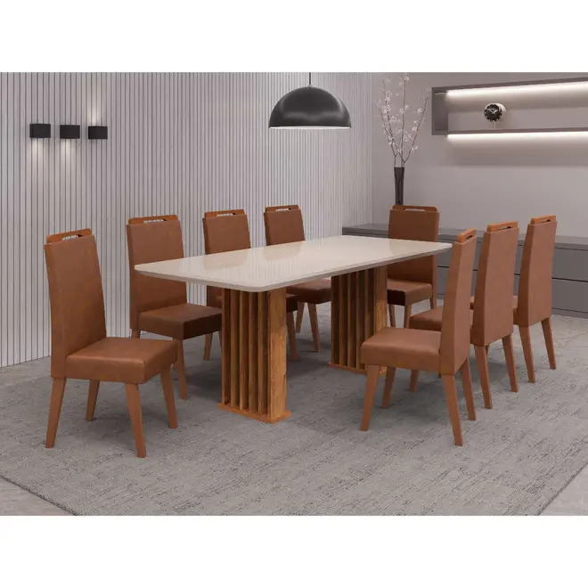 Conjunto Mesa de Jantar Munique 200x90cm com Vidro e 8 Cadeiras Lotus Viero – Mel/Blonde Off White