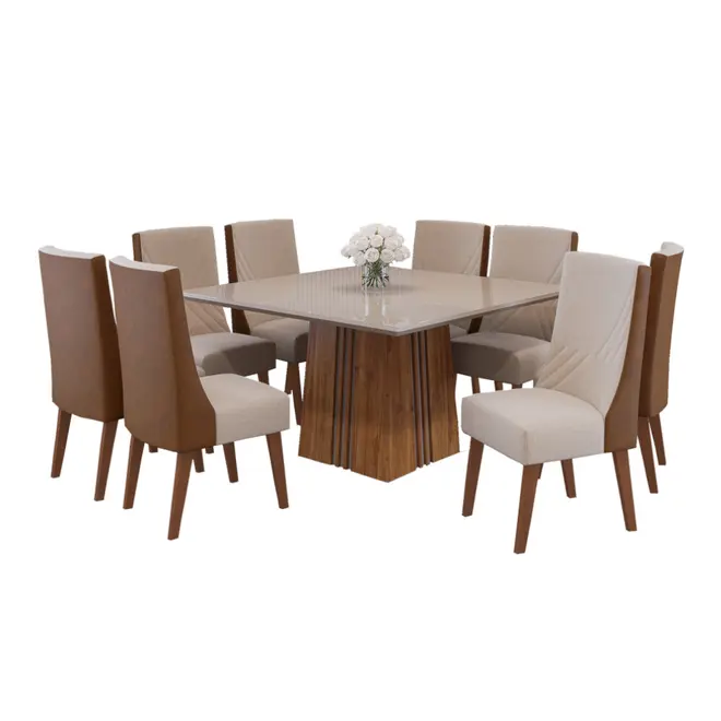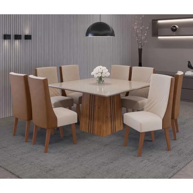 Não deixe essa oportunidade passar! Garanta agora mesmo o seu Conjunto de Jantar Mesa Rubi com 8 Cadeiras Topazio aqui na Schumann e transforme seu espaço com elegância e conforto!