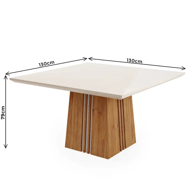 A Mesa Rubi se destaca no conjunto pelo seu design imponente, com tampo em MDF de 40mm e vidro sobreposto de 4mm, que garantem não apenas um visual elegante, mas também praticidade na hora da limpeza. Sua base com detalhes ripados e formato quadrado confere um ar moderno e marcante à peça. Com capacidade para acomodar até 8 pessoas, é ideal para receber a família ou amigos.