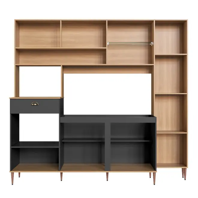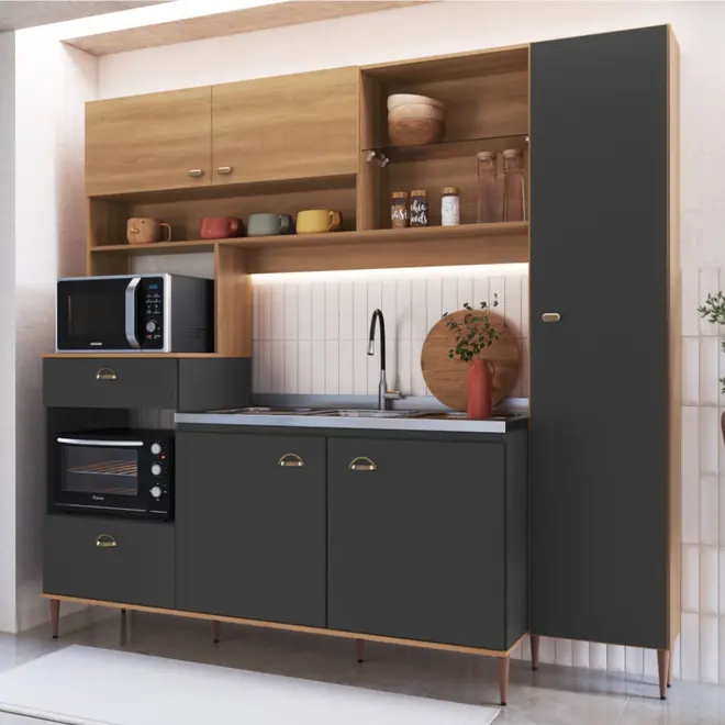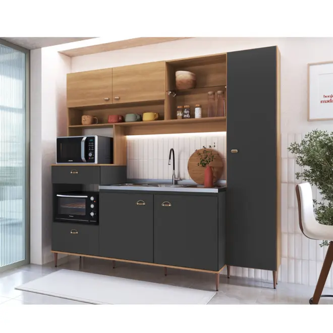 Composta por 6 portas com dobradiças de aço com amortecimento e 1 gaveta com corrediças telescópicas, a Karina garante suavidade no manuseio e um bom espaço interno para organizar seus utensílios da maneira que preferir. Seus nichos exclusivos para forno e micro-ondas, a prateleira de vidro decorativa e o espaço compatível com tampo ou pia de até 1,20m ampliam ainda mais a praticidade.