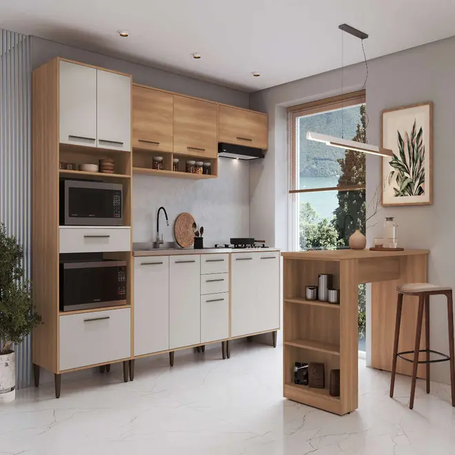 A Cozinha Jade é a escolha certa para você que busca praticidade, elegância e modernidade em um único móvel. Ela foi planejada pensando em cada detalhe para manter a organização do espaço, levando em sua composição chapas de MDP, material firme e resistente que garante ao mobiliário toda a sustentação necessária. Além disso, também é super útil e funcional para garantir um bom armazenamento e organização dos seus utensílios, isso pois ela conta com 11 portas, incluindo portas de bater e basculantes, amplo espaço interno com diversas prateleiras além de 2 nichos, espaço para forno e micro-ondas e uma belíssima bancada.