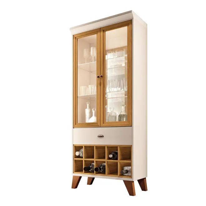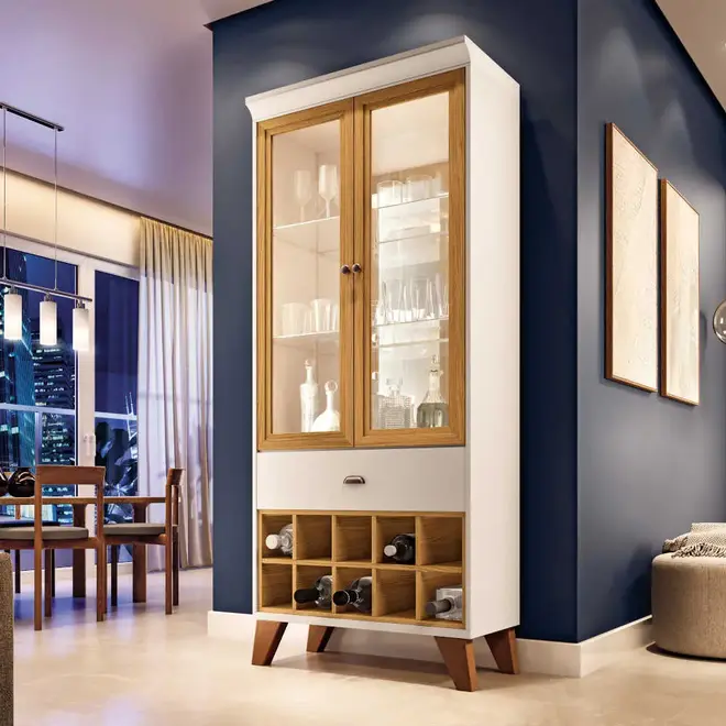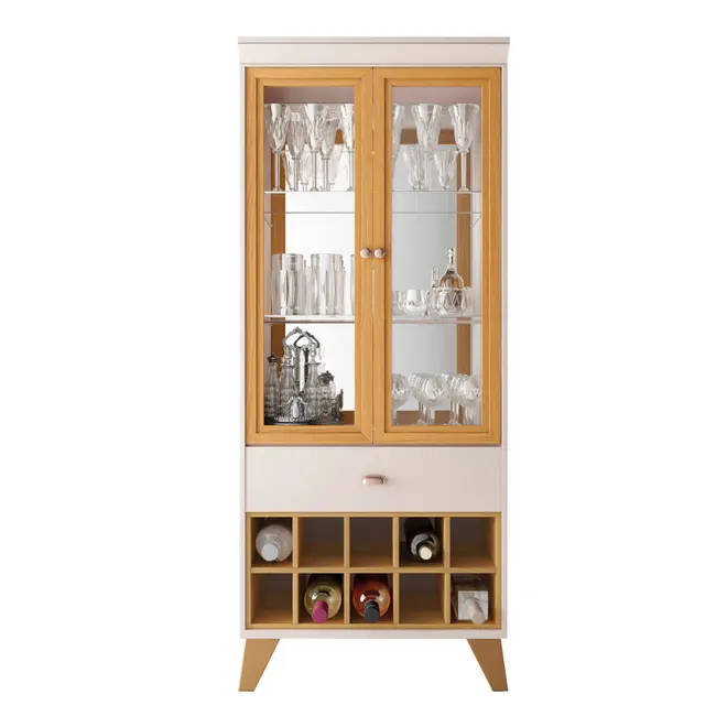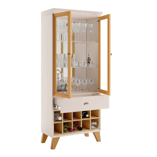 Seu design é retrô com cores lindas que vão combinar com diversos estilos e decorações, além é claro, de ser super funcional já que possui 2 portas com vidro e adega com garrafeiros para até 10 garrafas. Isso tudo sem contar o fundo da cristaleira que possui um espelho para dar um charme ainda maior.